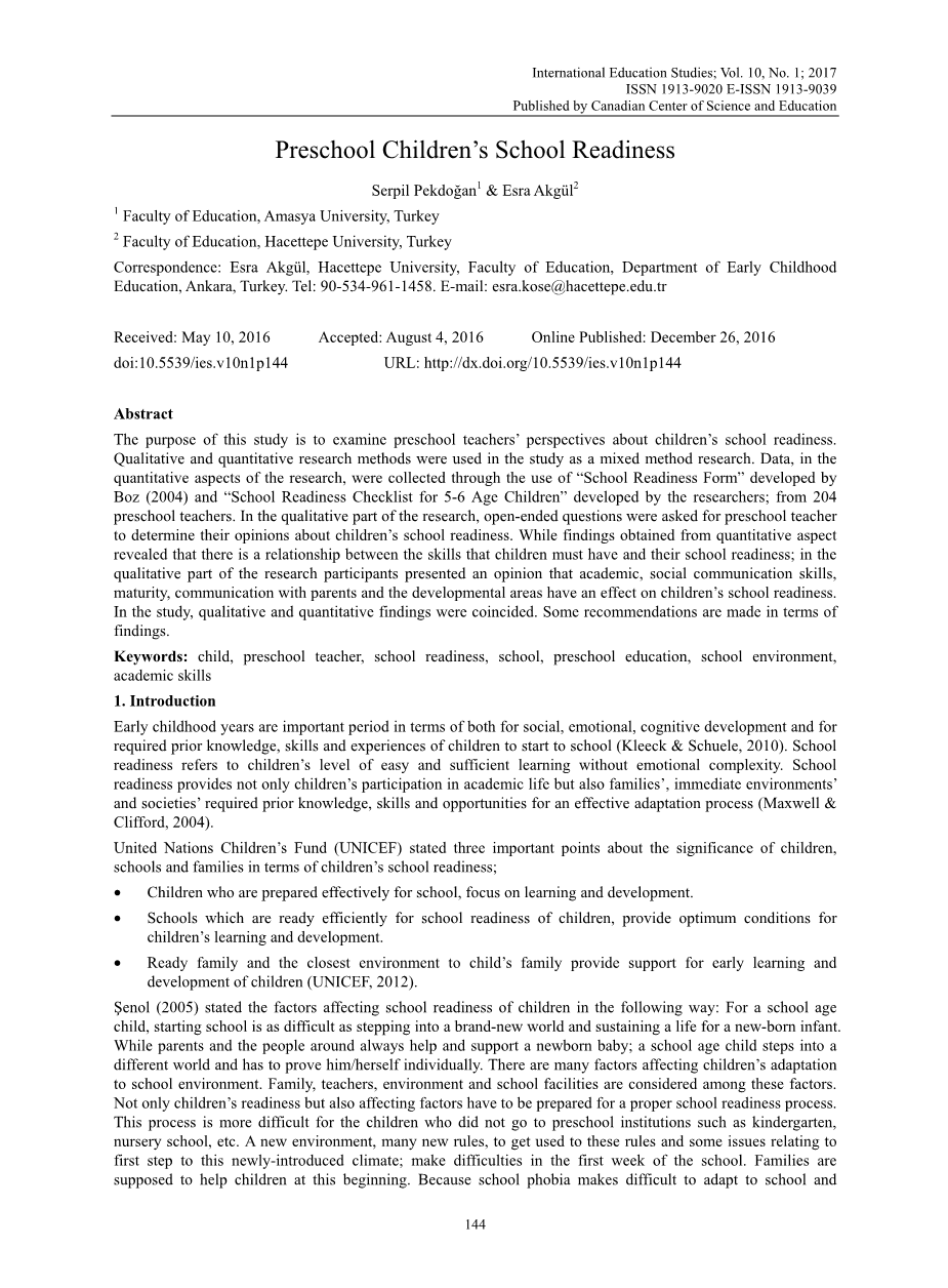 从研究中可以看出;对于孩子来说,达到一定的成熟度对于有效的入学准备是很重要的。这种成熟意味着在儿童的身体、心理、社会和情感发展方面达到一定水平,并准备好成功地完成学校要求他们完成的任务(圣阿塔洛克,1994年)。通过评估和评估活动,可以确定教育是否达到目标,并决定教育过程中的入学准备水平。此外,还需要进行评估和评估,以确定个人的准备程度。教育过程的开始和结束之间的差异必须从数量和质量上加以衡量,因为教育是一个改变行为的过程。在开始上学之前,应根据身体、心理、语言、社交、情感发展和自我照顾技能评估儿童的入学准备水平(Haktanır,2002)。同样,检测入学准备水平可以让孩子们根据个人差异和特点在学校接受咨询,识别个人需求,并根据需求制定计划、计划和准备(Yapıcı,2004)。教师在为孩子们上学做准备方面起着最重要的作用,因为特别是早年是孩子们的关键时期。教师应该意识到儿童入学准备的重要性,这是让儿童为下一个教育水平做好准备的一个重要因素。在研究过程中,还没有发现将定性和定量方法相结合,并检查学前教师对儿童入学准备状况的看法的研究。在本研究中,我们使用混合方法来搜索学前教师对儿童入学准备的看法,从而试图为这一领域做出贡献。在这种情况下,这项研究值得开展。