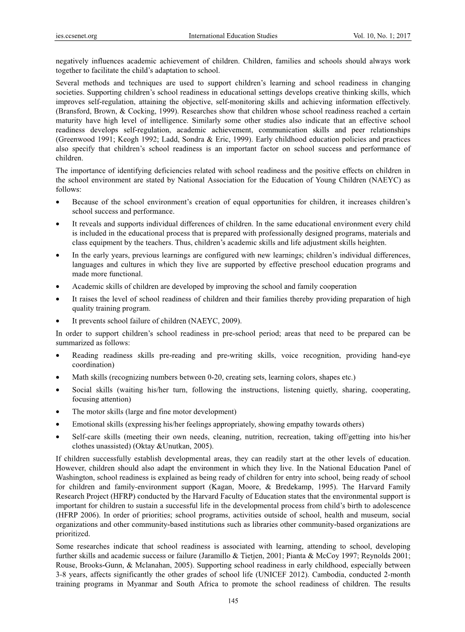 在不断变化的社会中,有几种方法和技术被用来支持儿童的学习和入学准备。支持儿童在教育环境中做好入学准备,培养创造性思维技能,从而提高自我调节、实现目标、自我监控技能和有效获取信息的能力。(Bransford,Brown和Cocking,1999年)。研究表明,入学准备达到一定程度的儿童智力水平较高。同样,其他一些研究也表明,有效的入学准备可以培养自我调节、学业成绩、沟通技能和同伴关系(Greenwood 1991;Keogh 1992;Ladd,Sondraamp;Eric,1999)。幼儿教育政策和实践也规定,儿童的入学准备是影响儿童学业成功和表现的重要因素。