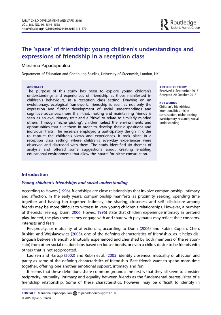 因此,这项工作的基本前提是,交朋友和维持朋友关系具有进化功能。它是与生俱来的,并有意的通过行为表达(Papadopoulou, 2012; Papadopoulou amp; Birch, 2007)。根据儿童的年龄、发育阶段和成熟因素,以及他们所经历的社会环境,这种动力可能在有意识和潜意识中以不同的方式经历和表达。换句话说,我们人类本能与他人结合的表现可能取决于发展和环境等一系列因素。