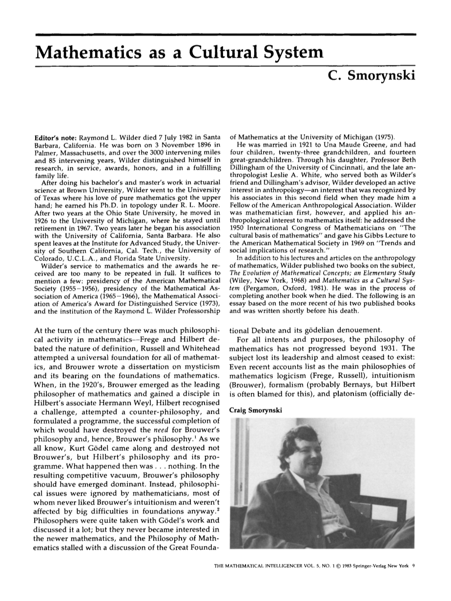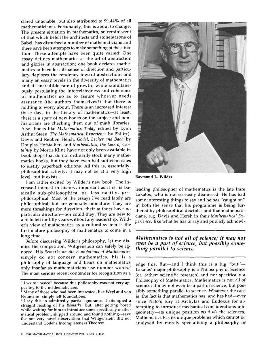 我对怀尔德的新书感到相当兴奋。对历史的兴趣增加了,尽管它很重要,但基本上是亚哲学的,或者不那么令人讨厌的,是前哲学的。我最近读到的大多数文章都是哲学的,但总体上都是不成熟的:它们只不过是在寻找方向;他们的作者没有特定的方向——他们也不可能:他们是一个50年来没有任何领导的领域的新人。怀尔德将数学作为一种文化系统的观点是很长一段时间以来第一个成熟的数学哲学。