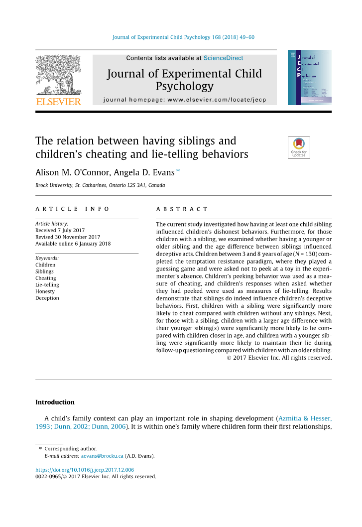 关键词:儿童;兄弟姐妹;作弊;说谎;诚实;欺骗