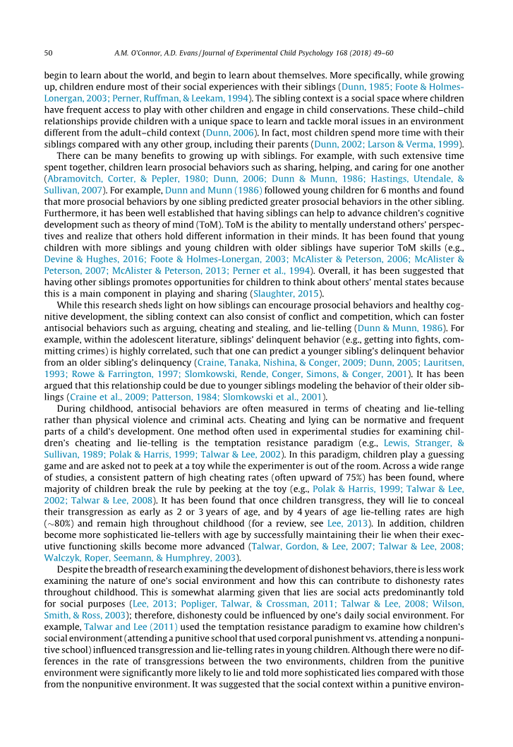 尽管对于不诚实行为发展的相关研究范围很广,但对于一个人所处的社会环境以及这如何影响贯穿整个童年时期的不诚实率的研究却很少。这有点令人担忧,因为说谎主要是出于社会目的而进行的社会行为(Lee, 2013; Popliger, Talwar, amp; Crossman, 2011; Talwar amp; Lee, 2008; Wilson, Smith, amp; Ross, 2003)。因此,一个人所处的社会环境可以影响其不诚实行为。例如,Talwar和Lee (2011) 曾使用抵抗诱惑范式考察儿童的社会环境(来自体罚学校或者来自无体罚学校)如何影响其违反规则与否以及说谎率。即使最后结果显示在两种环境下,儿童违反规则的发生率没有差异,但来自体罚学校的儿童与来自无体罚学校的儿童相比,说谎的可能性更大并且更老练。这表明在体罚这样的社会环境会促进儿童采用说谎的方式来避免严厉的惩罚,因此在这个研究中儿童的说谎率及维持谎言能力有所提高。这些结果强调了考察与不诚实行为有关的社会环境的重要性,尤其强调了特定的社会情境能够促进不诚实行为的产生。考虑到儿童和他们的兄弟姐妹会共同经历许多社会环境(Dunn, 1985; Foote amp; Holmes-Lonergan, 2003; Perner et al., 1994),所以在不诚实行为的发展中,兄弟姐妹情境可能是一个潜在的重要因素。