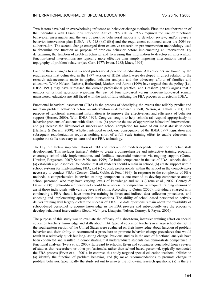 本研究的目的是评估短期强化培训对特殊教育教师功能性行为分析知识和技能的效果。在美国东南部一个大型学区的特殊教育教师接受了评估,他们对问题行为的功能的了解以及他们推荐一种程序的能力来促进行为改变程序,该程序将导致相对快速但持久的改变。先前在功能分析进行的研究表明,本科生可以展示功能分析的能力(Iwata等人,2000年)。关于学校,Ervin及其同事从审查中得出结论研究人员或其他专业人员而非学校人员通常进行 功能性行为分析流程的研究(Ervin等人,2001)。相比之下,本研究针对特殊教育教师的能力(a)识别问题行为的功能,以及(b)提出促进问题行为改变的建议。具体而言,该研究旨在回答以下研究问题:(a)未经培训和受过培训的教师识别学生问题功能的能力是否存在差异?(b)未经培训和受过培训的教师在提出改变问题的建议的能力上是否存在差异?由大城市地区进行的简短培训计划导致的行为?