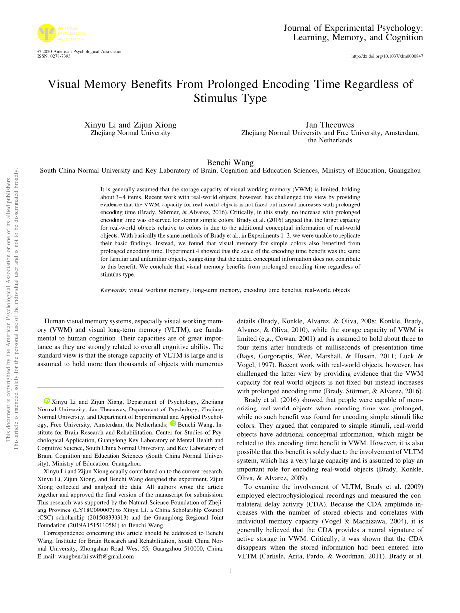 尽管Brady等人(2016)认为真实世界的对象存储在一个活跃的VWM系统中,但他们并没有排除这些对象也存储在VLTM中的可能性。也就是说,参与者可以同时使用两种不同的记忆系统来在视觉记忆中存储更多的东西。例如,Brady等人(2016)声称“当前的数据不排除现实世界的物体也会导致比简单刺激更好的情景性长期记忆表征的想法(除了在主动工作记忆系统中更好的表征)”(p. 7462)。此外,应该指出的是,Quirk和Vogel(2017)未能复制Brady等人的关键CDA结果(更多的参与者和更多的试验,以增加统计力)。他们在3个和5个真实世界的物体之间没有显示出可靠的差异(Brady et al.,2016年采用了相同的刺激集)。此外,他们未能复制关键的行为发现,而是表明随着编码时间的延长,记忆性能提高了简单的颜色和现实世界的物体。这些在重复基本效应上的失败使得关于在VWM中为真实世界物体提供更多容量的结论不那么令人信服。