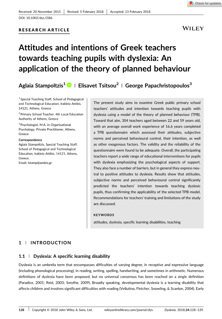 希腊教师对阅读障碍学生的态度和意图:计划行为理论的应用