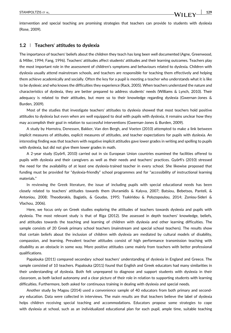 在这里,我们只关注希腊研究,探讨教师对阅读障碍和患有阅读障碍的学生的态度。最相关的研究是里加(2012)的研究。她深入评估了教师对患有诵读困难和其他学习困难的儿童的教与学的知识、信念和态度。样本包括20名希腊小学教师(主流和特殊学校教师)。结果表明,关于纳入阅读障碍儿童的某些信念是由残疾、同情和学习的文化模式介导的。普遍的教师态度包括高绩效的传递教学,残疾在某种程度上是一种障碍。更积极的态度主要来自专业资格较好的教师。