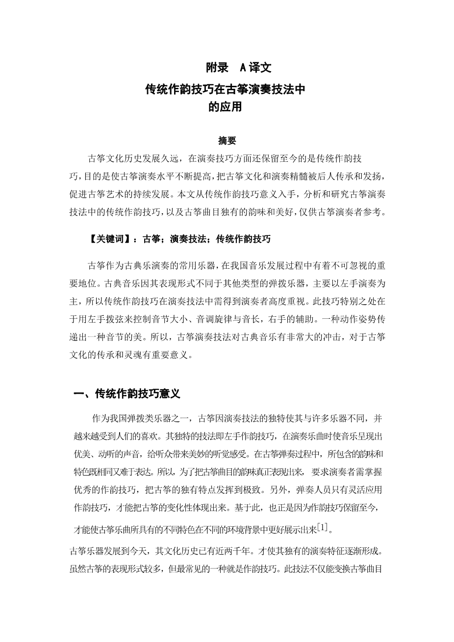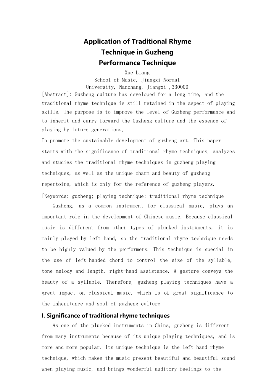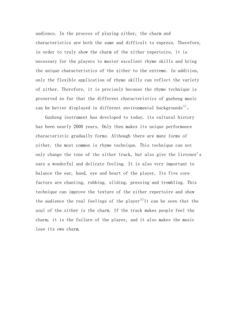 传统作韵技巧在古筝演奏技法中的应用外文翻译资料 2023-07-27 10:54:12 英语原文共 6 页,剩余内容已隐藏,支付完成后下载完整资料 英语译文共 3 页,剩余内容已隐藏,支付完成后下载完整资料 资料编号:[604843],资料为PDF文档或Word文档,PDF文档可免费转换为Word 原文和译文剩余内容已隐藏,您需要先支付 30元 才能查看原文和译文全部内容!立即支付 发小红书推广免费获取该资料资格。点击链接进入获取推广文案即可: Ai一键组稿 | 降AI率 | 降重复率 | 论文一键排版 PREVIOUS NEXT 您可能感兴趣的文章 音乐启发训练分析外文翻译资料 古筝史外文翻译资料 从序列看五声性——中国当代音乐中不同传统的整合外文翻译资料 浅析新疆歌曲《曲蔓地》的演唱风格及技巧分析外文翻译资料 从戏曲到谭盾的中国戏曲打击乐外文翻译资料 我们时代的音乐教学:学生音乐教师对音乐教育、教师教育和成为教师的思考外文翻译资料 我们时代的音乐教学:学生音乐教师对音乐教育、教师教育和成为教师的思考外文翻译资料 莫扎特的降E大调小提琴协奏曲外文翻译资料 文化视域下古筝艺术表演技法的传承与创新研究外文翻译资料 文化视角下古筝表演艺术的传承与创新研究外文翻译资料
