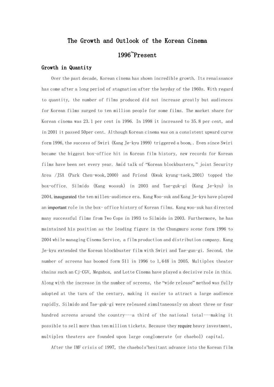 Over the past decade, Korean cinema has shown incredible growth. Its renaissance has come after a long period of stagnation after the heyday of the 1960s. With regard to quantity, the number of films produced did not increase greatly but audiences for Korean films surged to ten million people for some films. The market share for Korean cinema was 23.1 per cent in 1996. In 1998 it increased to 35.8 per cent, and in 2001 it passed 50per cent. Although Korean cinema was on a consistent upward curve form 1996,the success of Swiri (Kang Je-kyu 1999) triggered a boom,. Even since Swiri became the biggest box-office hit in Korean film history, new records for Korean films have been set every year. Amid talk of “Korean blockbusters,” joint Security Area /JSA (Park Chen-wook,2000) and Friend (Kwak kyung-taek,2001) topped the box-office. Silmido (Kang woosuk) in 2003 and Tae-guk-gi (Kang Je-kyu) in 2004,inaugurated the ten millen-audience era. Kang Woo-suk and Kang Je-kyu have played an important role in the box- office history of Korean films. Kang woo-suk has directed many successful films from Two Cops in 1993 to Silmido in 2003. Furthermore, he has maintained his position as the leading figure in the Chungmuro scene form 1996 to 2004 while managing Cinema Service, a film production and distribution company. Kang Je-kyu extended the Korean blockbuster film with Swiri and Tae-gun-gi. Second, the number of screens has boomed form 511 in 1996 to 1,648 in 2005. Multiplex theater chains such an Cj-CGV, Megabox, and Lotte Cinema have played a decisive role in this. Along with the increase in the number of screens, the “wide release” method was fully adopted at the turn of the century, making it easier to attract a large audience rapidly. Silmido and Tae-guk-gi were released simultaneously on about three or four hundred screens around the country---a third of the national total---making it possible to sell more than ten million tickets. Because they require heavy investment, multiplex theaters are founded upon large conglomerate (or chaebol) capital.