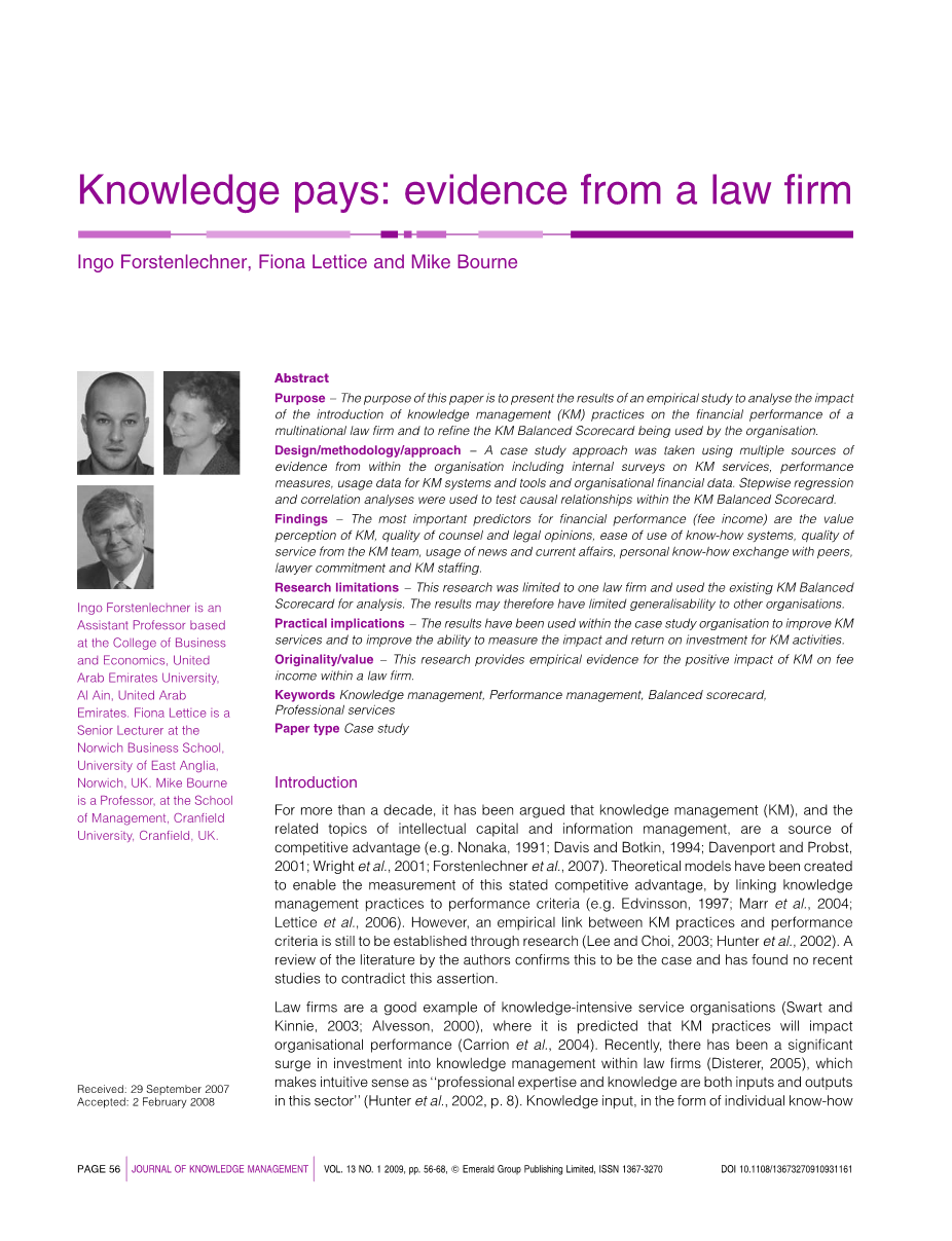 原创性/价值 - 这项研究为知识管理对律师事务所收费收入的正面影响提供了经验证据。