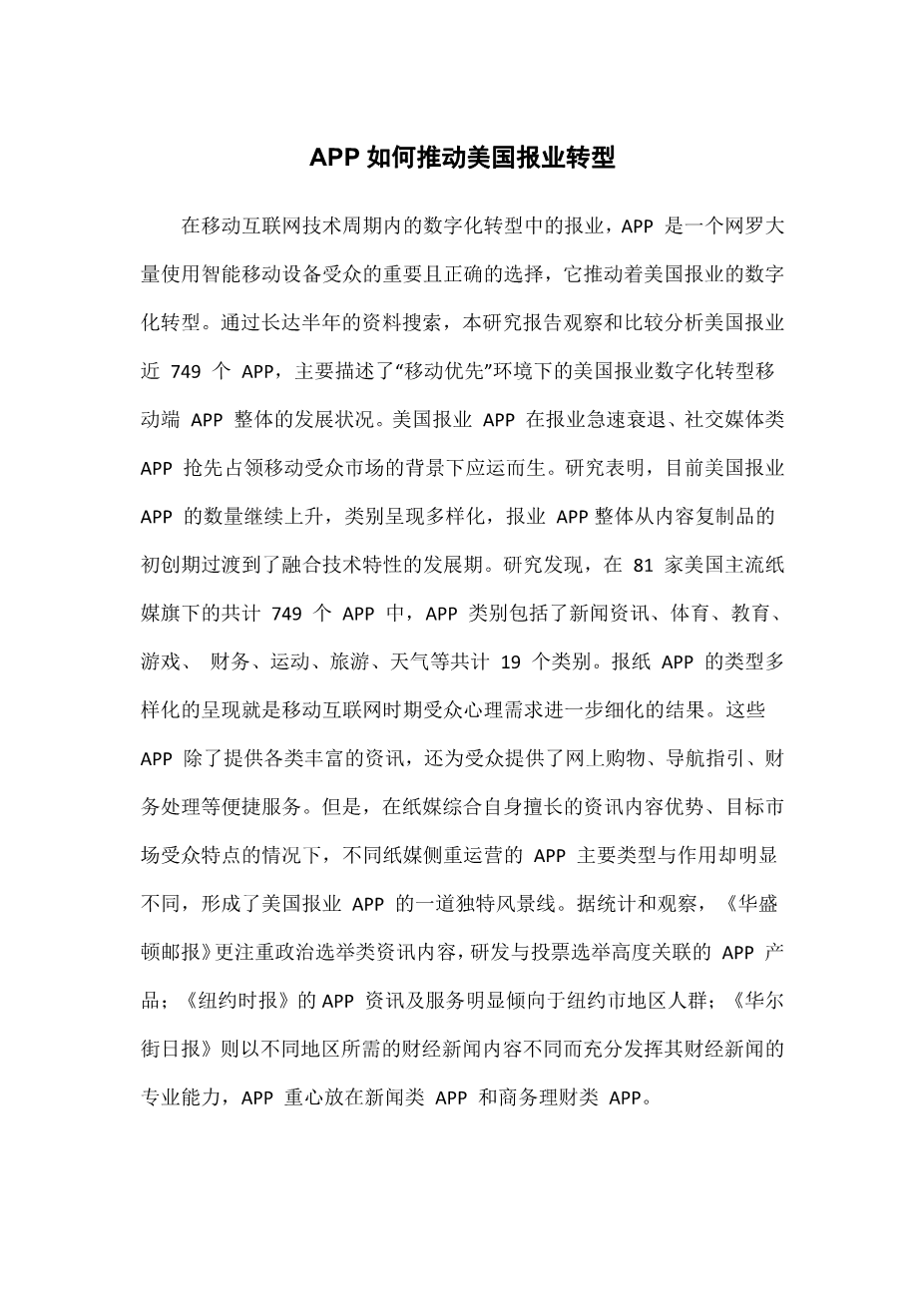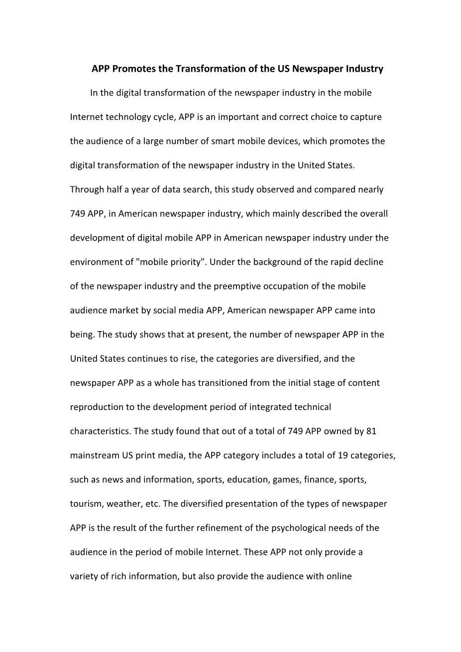 中国新闻类APP的现状和问题外文翻译资料 2022-02-27 22:27:15 英语原文共 5 页,剩余内容已隐藏,支付完成后下载完整资料 英语译文共 3 页,剩余内容已隐藏,支付完成后下载完整资料资料编号:[432344],资料为PDF文档或Word文档,PDF文档可免费转换为Word 原文和译文剩余内容已隐藏,您需要先支付 30元 才能查看原文和译文全部内容!立即支付 发小红书推广免费获取该资料资格。点击链接进入获取推广文案即可: Ai一键组稿 | 降AI率 | 降重复率 | 论文一键排版 PREVIOUS NEXT 您可能感兴趣的文章 社交网站上的情绪披露:网络结构和心理需求的作用外文翻译资料 社会自我——“我”的意义及各种表现外文翻译资料 中美花木兰:从前现代到现代外文翻译资料 简析纸媒转型新路线 什么是新媒体?外文翻译资料 营销人员的行为经济学指南外文翻译资料 有效的计划微博营销外文翻译资料 网络主播的行业前景与现存问题外文翻译资料 浅析网络游戏直播——以《剑网3》为例外文翻译资料 电视娱乐化 交叉媒介与知识——一个研究项目外文翻译资料 社交媒体在体育俱乐部中的应用潜力 – 粉丝沟通与知识管理外文翻译资料