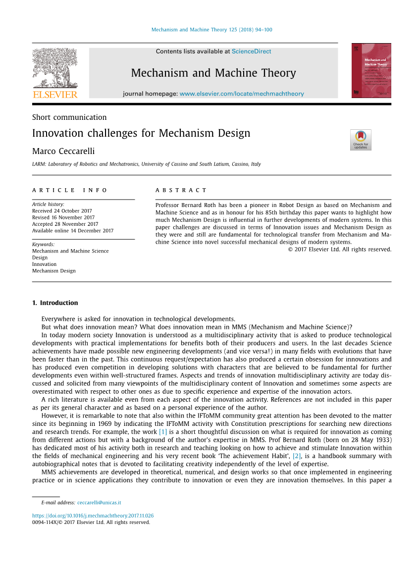 然而,值得注意的是,同样在IFToMM社区内,自1969年以来,通过宪法处方指示IFToMM活动以寻找新的方向和研究趋势的方法就一直被关注。例如,工作[1]是一个简短深思熟虑的讨论,讨论创新所需的内容来自不同的行动,但背景是作者在MMS方面的专业知识。Bernard Roth教授(1933年5月28日出生)业已将他的大部分活动都投入到探究如何在机械工程领域实现和激发创新的研究和教学,以及他最近出版的《成就习惯》一书中[2]。这是一本自传体笔记的手册摘要,专门用于促进独立于专业水平的创造力。