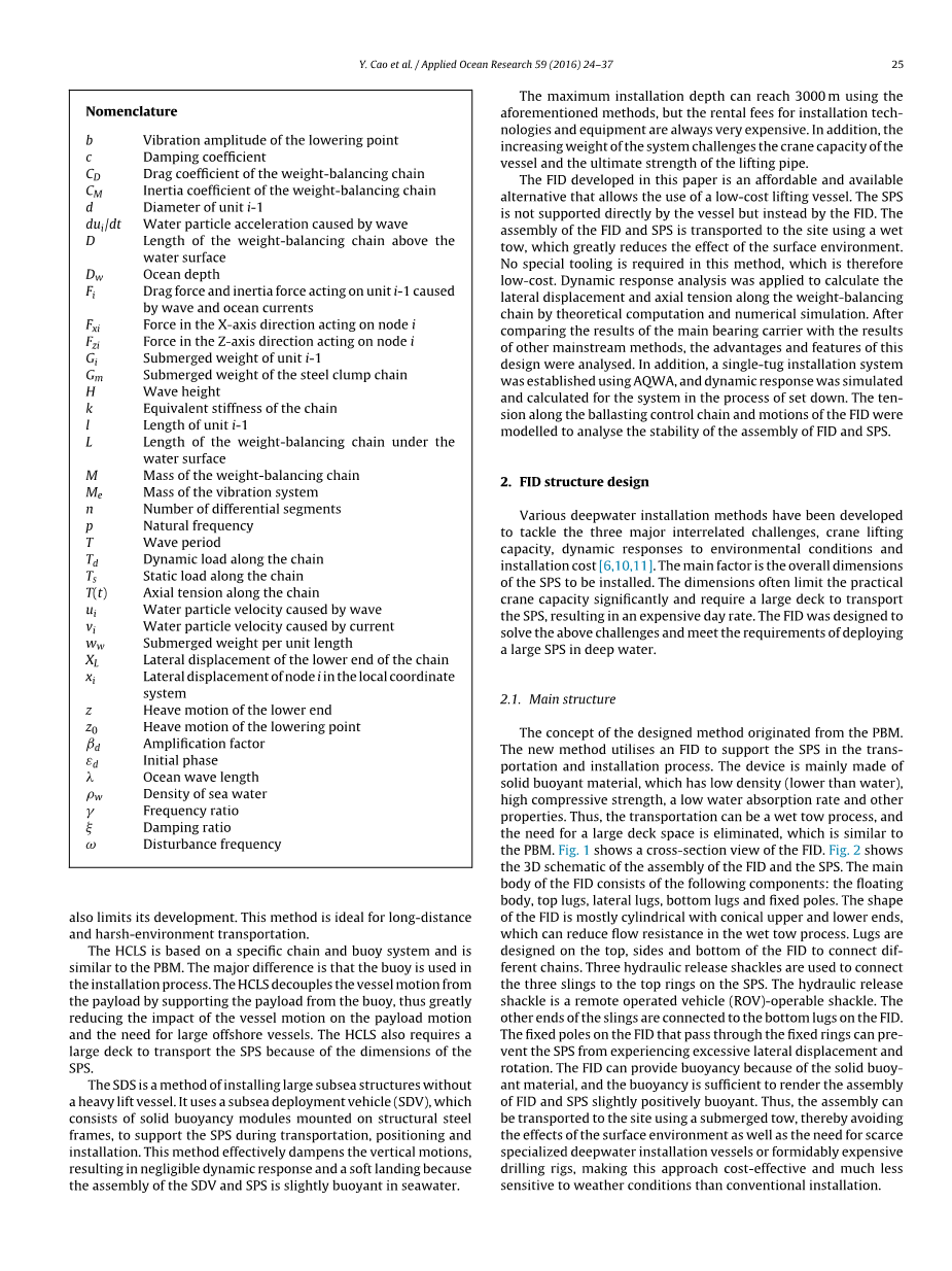 设计方法的概念起源于PBM。新方法利用FID在传输和安装过程中支持SPS。该设备主要由坚固的浮力材料,密度低(低于水),高抗压强度,低吸水率等属性。因此,运输可以是湿拖曳过程,和消除了对大型甲板空间的需求,这类似于PBM。图1显示了FID的横截面视图。图2显示FID和SPS组装的3D原理图。主要的FID的主体由以下组件组成:浮动主体,顶部凸耳,侧面凸耳,底部凸耳和固定杆。形状FID大多是圆柱形的,具有圆锥形的上端和下端,这可以降低湿拖丝过程中的流动阻力。耳环是设计在FID的顶部,侧面和底部,以连接不同的链条。三个液压释放钩环用于连接三个吊索到SPS上的顶环。液压释放卸扣是一种可操作的卸扣车(ROV)。该吊索的另一端连接到FID上的底部凸耳。穿过固定环的FID上的固定杆可以防止SPS经受过度的横向位移和回转。由于固体浮标材料,FID可以提供浮力,并且浮力足以使组件成为可能FID和SPS略微积极上扬。因此,组装可以使用浸没式拖车运输到现场,从而避免表面环境的影响以及稀缺的需要专业的深水安装船或昂贵的钻井平台,使这种方法具有成本效益,而且更少