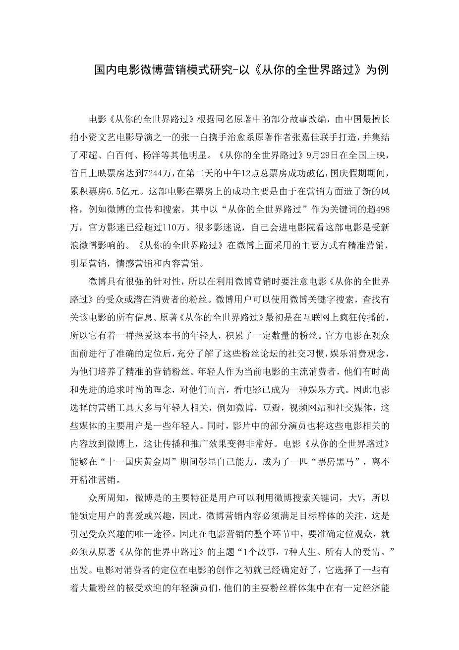Research on Micro-blog Marketing Mode of Domestic Films ——Take "Pass Through Your World" as an example
