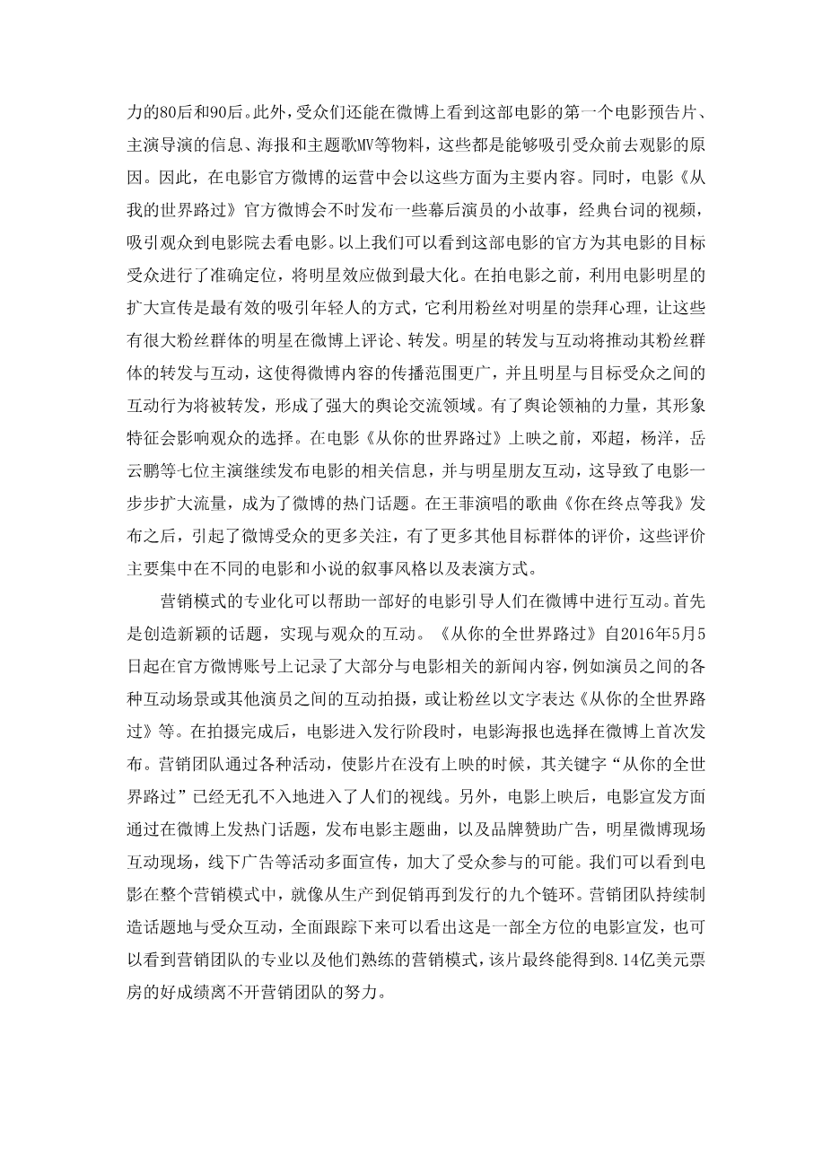 We all know that micro-blog is a major feature of the user can find micro-blog search keywords, blogger, users love or interest therefore, micro-blog marketing content to cater to the target group's concerns, the only way to arouse the interest of the audience, so in the movie marketing in the whole link accurate positioning of the audience it is necessary to something from your main reading world pass the original novel is "young man, the seven starring movie is the choice of the fans extremely popular artists and fans of these young actor's main strength is mainly concentrated in a certain economic capacity of 80 after 90, clearly the consumer positioning it so the film at the beginning of the creation. In addition, the audience is watching this movie is the first movie trailer, starring the director, information, posters and the big theme song MV The influence factors. Therefore, in its official micro-blog operation, to the main content of these aspects, and the movie passing from your world gt; official micro-blog will from time to time to release some actors behind the scenes in the novel, the classic lines, attract the audience to the cinema viewing. From the above we can see that movie. The official for the positioning of their target audience of film accurately. Celebrity Effect Maximization. In the film before, through the expansion of movie star publicity is the most effective way to the attention of young people now have star worship, these stars have a strong fanbase, stars in the micro-blog fans will be every word and action, comments forwarded. In addition the star forwarding and interaction will forward and interaction driven by their fans groups, making micro-blog content transmission range is wider, and the interactive behavior will be forwarded between the star and the target audience formed a strong public opinion field and exchange. There are stars of opinion leaders force and its image characteristics will affect the choice of viewing audience. Before the movie from your world pass gt; release, seven starring Deng Chao, the film Yang Yang, Yue Yunpeng and other related information continue to release the film, and interact with the star friends, which led to fans of the film in the forward Into the hot topic of micro-blog. There are days before the release of Faye Wong singing of the song "you wait for me in the end point gt;MV after the broadcast is caused by forwarding. In addition the movie stars of the film audience after mixed reviews, these evaluations mainly concentrated in different movie and novel narrative style, and the acting. Specialization of Marketing Model. A good movie can lead the people to interact in micro-blog, the first is to create innovative topics, and to implement interaction with the audience. The movie passing from your world on the official Sina micro-blog in 2016 at the start of May 5th update, micro-blog recorded most of the content related news film, such as shooting in the actor between various interactive scenes, or some other actors, interaction with the fans, or a "passing from your world on some classic quotations. After filming completed into the release period, mo