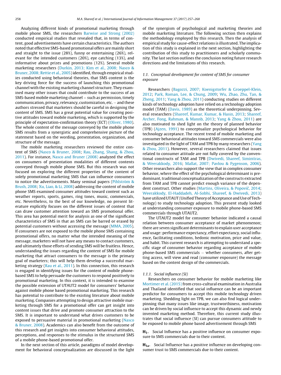 手机短消息服务(SMS)已经在近期被营销人员用作在消费者沟通渠道结构中推出新媒体。它可以单独发布或与现有渠道配对,用于不同营销人员的促销活动。一条短信包含广告或任何促销优惠或通过这个虚拟移动渠道的关系营销主题,可以以最低的价格不断发送给潜在客户。消费者可以随时随地访问产品/服务提供商提供的这些商业信息(Kim, Park, amp; Oh, 2008; Nasco amp; Bruner, 2008; Rettie, Grandcolas, amp; Deakins, 2005)。任何产品/服务制造商,零售商或第三方都可以以最少的努力,时间和成本通过短信向数百万潜在客户发送消息,希望客户可以响应消息的预期含义。然而,未经事先许可,来自未知方的消息和消息的过量频率可能会使客户在创新和动态的移动产品/服务促销营销渠道产生消极态度(Pihlström amp; Brush, 2008)。可以证明,通过移动电话的信息的有效性,声誉和可信度是其有效性的关键问题(MMA, 2005; Nasco amp; Bruner, 2008)。可以推断,基于手机的SMS广告作为促销营销工具的成功取决于措辞,陈述,语言,表达——换言之,消息的整体内容(Durkin, 2013; Kim et al., 2008; MMA, 2005; Nasco amp; Bruner, 2008)。但是,如果消费者不接触含有促销优惠的手机短信,营销人员不会通过向潜在消费者发送短信来获得任何好处。这项目前的研究正在通过实验来探索消费者的这种态度方面,以进一步延伸技术接受和使用统一理论的扩展理论(UTAUT2)(Venkatesh, Thong, amp; Xu, 2012)。