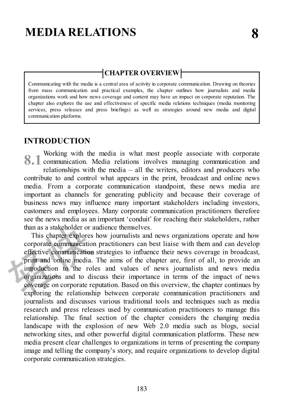 本章将探讨记者和新闻机构如何运作,以及企业传播人员如何与他们进行最佳沟通,并制定有效的沟通策略来影响印刷和在线媒体的传播。首先,本章的目的是提供一个介绍记者和新闻媒体的作用和价值,并讨论它们在新闻影响方面的重要性,包括企业声誉。基于这个概述,本章继续探索商业沟通从业者与公司之间的关系,讨论各种传统工具和技术,如媒体通信。从业人员使用研究和新闻稿来管理这一点的关系。本章的最后部分考虑更换媒体,随着新的Web 2.0媒体的爆炸性增长,如博客,社交媒体、网站和其他强大的数字通信平台。这些新的媒体对该公司的组织提出了明显的挑战,在讲述公司的故事形象上,并要求组织开发数字化企业传播策略。