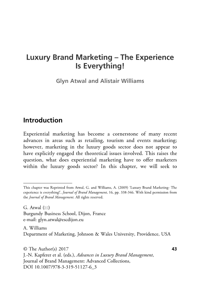 体验式营销已成为零售,旅游业和事件营销等领域许多最新进展的基石。但是,奢侈品营销似乎并没有明确涉及该理论。这就提出了一个问题,体验式营销必须为奢侈品行业的营销人员提供什么?在本章中,我们将尝试引入体验式营销的探讨,并将论证该概念涉及的问题对奢侈品行业内制定和实施有效的营销策略至关重要。奢侈品营销变得越来越复杂,这不仅与传达其质量、性能和真实形象有关,而且也与其试图销售一种和消费者的生活方式相联系的体验有关。奢侈品的特征表明,该行业内的营销不同于许多其他行业。尽管有关这些感知差异的文献很多,但是调查表明,奢侈品行业的营销很大程度上依赖于传统的营销概念,并且通常很难将奢侈品营销方式与其他消费品的营销方式区分开。