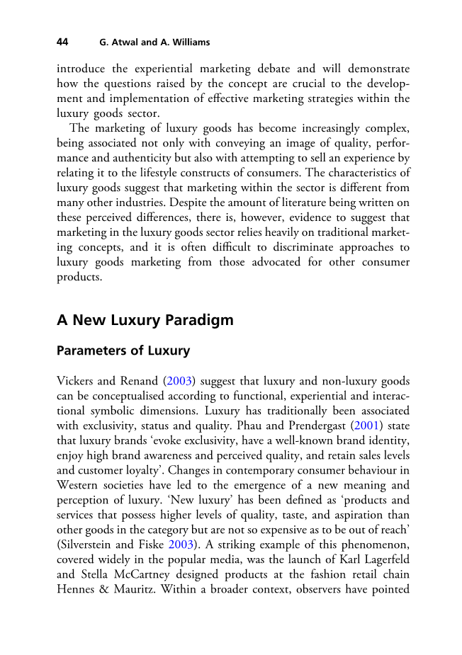 Vickers和Renand(2003)提出,可以根据功能、体验和交互性符号这三个维度对奢侈品和非奢侈品进行概念化限定。根据传统,奢侈品与排他性、地位和质量相关。 Pha和Prendergast(2001)指出,奢侈品牌“具有排他性、品牌知名性的特征,享有高品牌知名度和高质量,并能保持销售水平和客户忠诚度”。西方社会当代消费者的行为变化导致了新的奢侈品含义的出现。“新奢侈品”被定义为“与同类产品相比具有更高的质量、更棒的品味和更优质的产品服务,但又不至于价格昂贵”(Silverstein and Fiske 2003)。流行媒体广泛报道的这一现象的一个突出例子是在时尚零售连锁店Hennes&Maurit推出了Karl Lagerfeld和Stella McCartney设计的产品。在更广阔的背景下,观察者指出了中型市场消费者购买趋势,这被称为“社会的奢侈品化”(Yeoman and McMahon-Beattie 2006)。在全球范围内,这种趋势似乎很明显。Atwal和Khan(2008)讨论了印度中产阶级快速增长的重要性,印度中产阶级“不再与奢侈品有经济上的距离,而是为了满足当前的愿望而交易”。于是,该部门的营销人员需要重新定义营销策略以应对这些变化。