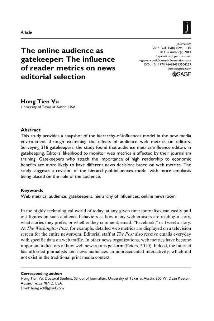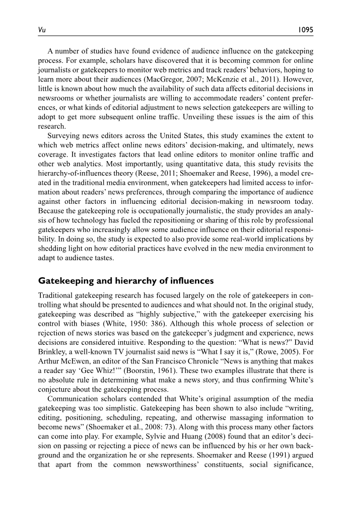 实证的把关研究发现,网络受众指标影响记者的证据。例如,在一项人种学研究中,Anderson报告说,在Philly网站上,受众指标是判断新闻的“主要因素”。然而,与MacGregor和Domingo的研究一样,这项研究的定性特征使其结果不适用于更大的群体。更重要的是,记者们愿意向受众的选择而妥协的把关仍是一个不真实的事。因此,有必要问: