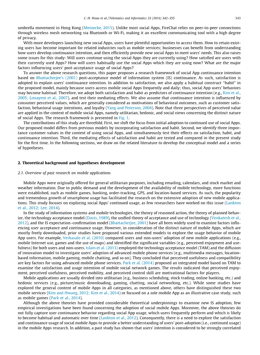 虽然上述理论提供了相当的理论基础来研究新的应用程序使用,但很少有关于使用移动应用程序的实证研究。此外,上述理论没有完全捕获用户对社交应用程序的延续使用,哪些用户使用频繁,哪些是可以随着时间的推移成为习惯性的行为(Lankton et al., 2012)。因此,为了更好地理解用户的采纳后行为,有必要通过探索社会满意度和延续使用移动应用程序来研究社交应用。此外,过去的研究表明,用户的意愿被认为与其意志行为有着密切的联系,信息系统延续考虑的主要因素是实际使用(Ajzen, 1991)。因此,我们的重点是延续的意图而不是行为。