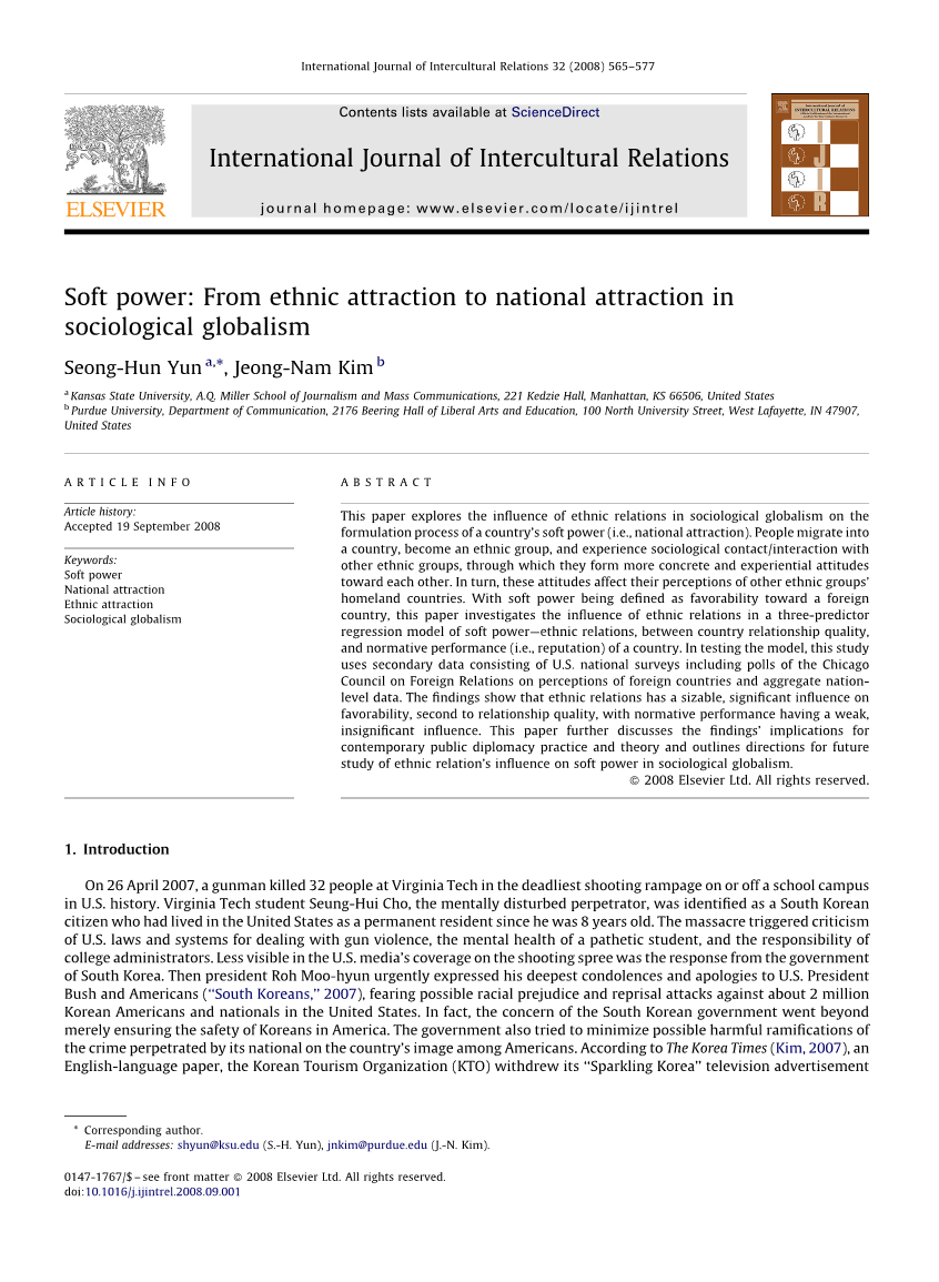 从表面上看,韩国政府的反应是迅速的道歉,用低调的方式在国外处理了国家的形象危机;以及危机事件是由韩国人在精神错乱的情况下狰狞、异常的行为中和允许枪支使用的美国文化中发生的。但是,从大局来看,韩国政府的关注倒是一个在社会学全球化的又无人值守的动态中的显著的一国的国家形象或吸引的制定过程。人们迁移到一个国家,成为一个族群,体验历史、社会和日常生活接触/相互作用(即民族关系)。在这些关系中,族群形成对彼此更加具体和惯性的看法或态度(即吸引力)。反过来,这些影响到他们对其他民族国家的看法。