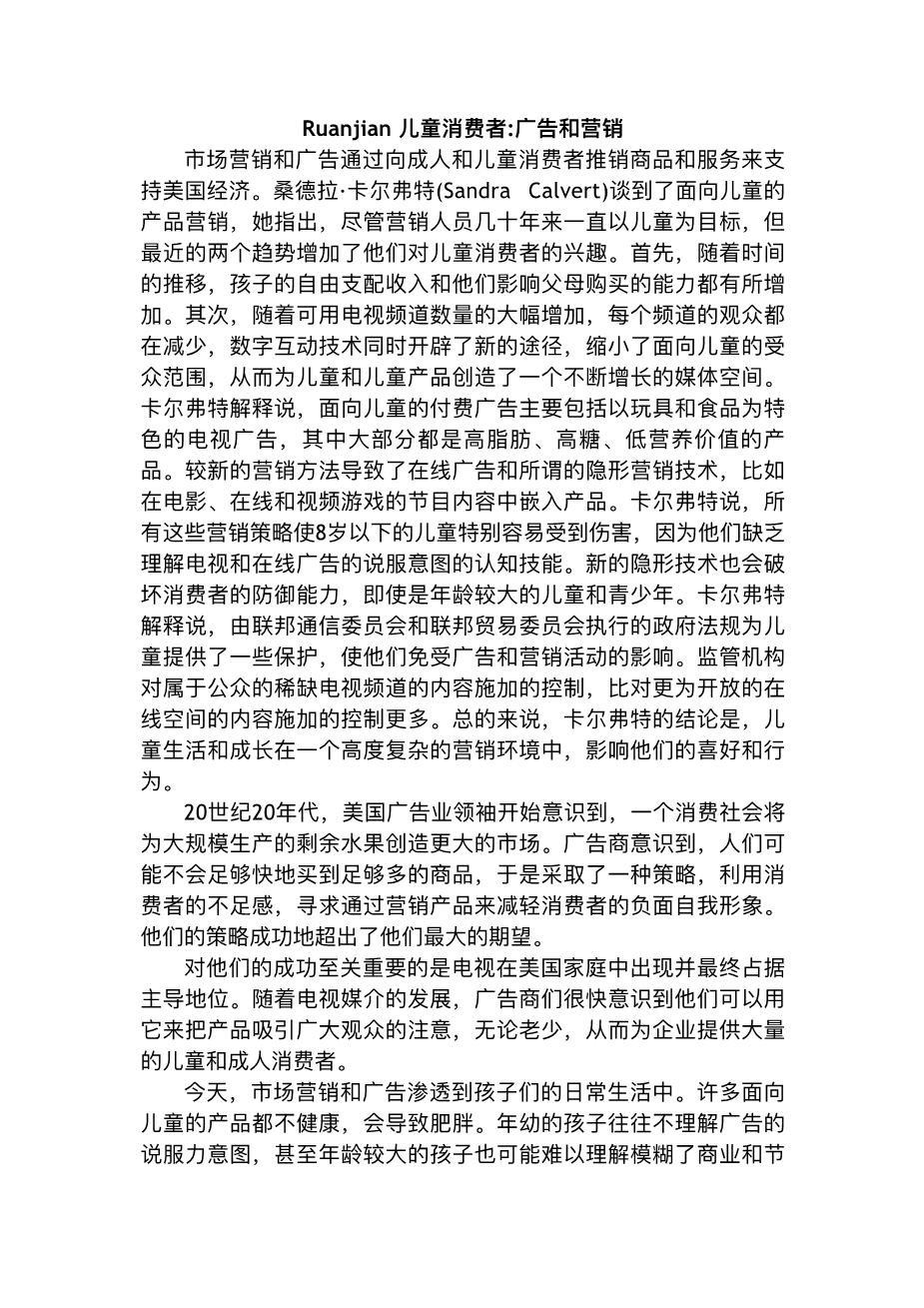 both on how children of different ages—and, more important, at different stages of cogni- tive development—perceive commercials in different ways and on how advertising affects childrenrsquo;s behaviors and attitudes. I turn then to how families and parents may mediate the impact of advertisements on their children and discuss the commercialization that results as marketers expand their presence in the public schools. I conclude by considering regulatory issues, including First Amendment concerns.