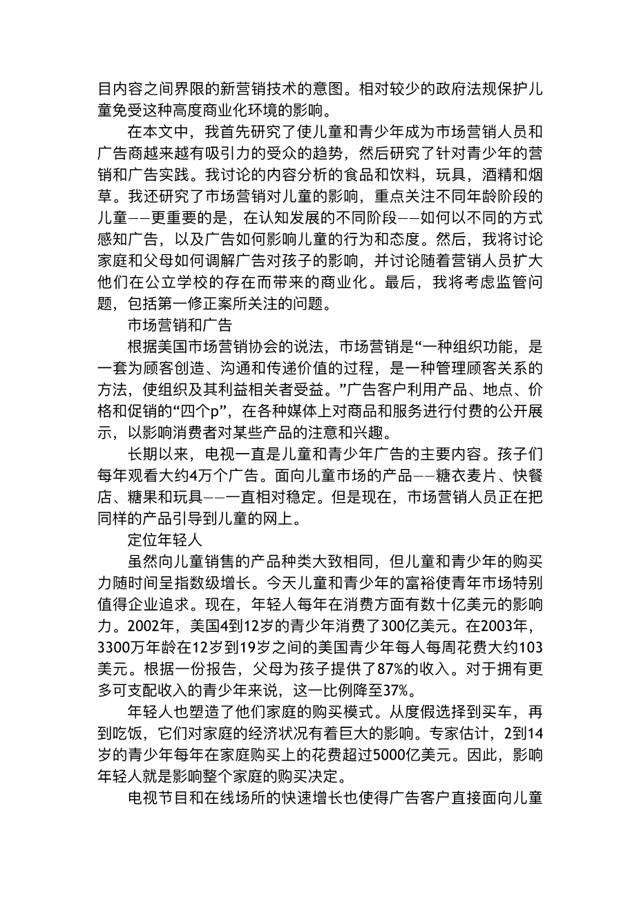 In this article, I first examine trends that have made children and youth an ever more attrac- tive audience for marketers and advertisers and then look at marketing and advertising practices directed toward youth. I discuss content analyses of foods and beverages, toys, and alcohol and tobacco. I also examine the effects of marketing on children, focusing