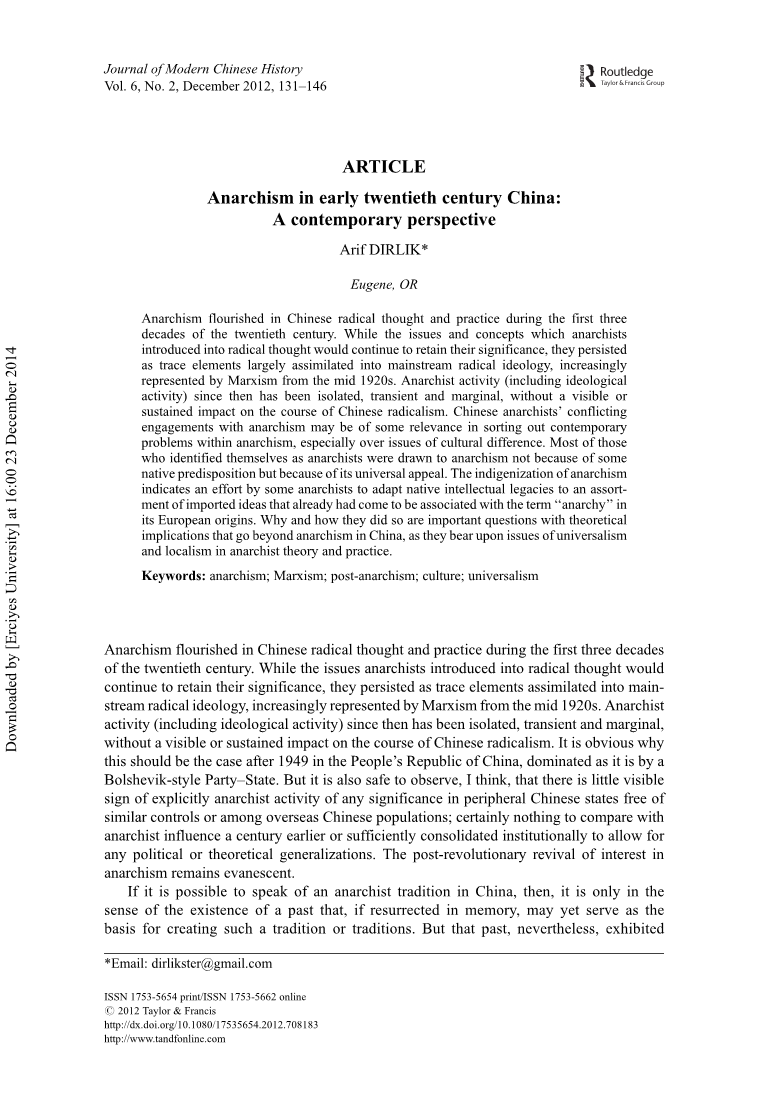 无政府主义在二十世纪前三十年的中国激进思想和实践中盛行。尽管无政府主义者引入激进思想的问题将继续保持其重要性,但它们作为融入主流激进意识形态的微量元素而持续存在,从20世纪20年代中期开始,马克思主义越来越多地代表了主流激进意识形态。从那时起,无政府主义活动(包括意识形态活动)一直是孤立的、短暂的和边缘的,对中国激进主义的进程没有可见的或持续的影响。显而易见,为什么在1949年后的中华人民共和国(以布尔什维克式的党派国家为主导)会是这种情况。但我认为,在没有类似统治的中国周边国家或海外华人中,几乎没有明显的无政府主义活动迹象。毫无疑问,没有什么可以与一个世纪前的无政府主义影响相提并论,也没有什么可以在制度上得到足够的巩固,以允许任何政治或理论上的概括。对无政府主义的兴趣在革命后的复兴仍然转瞬即逝。