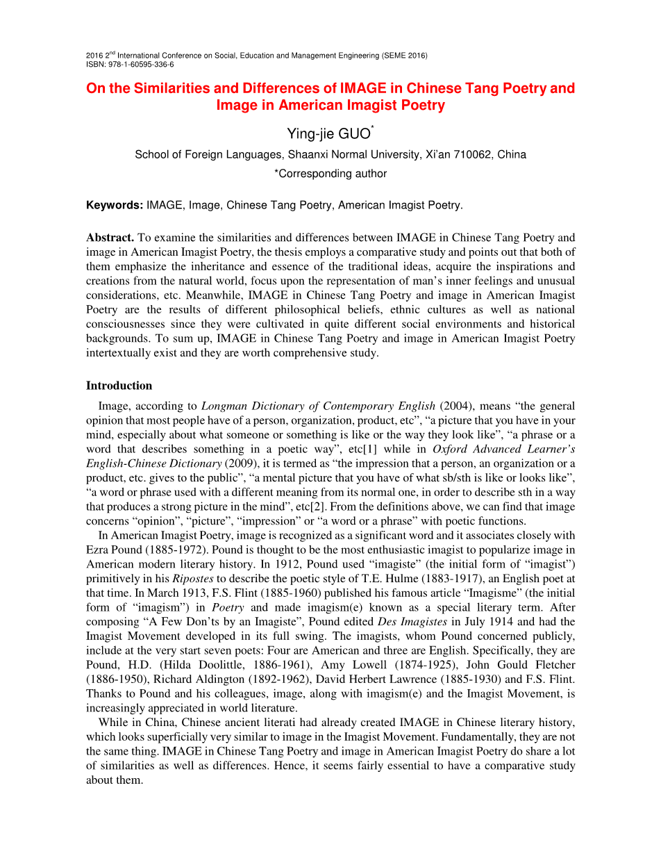 而在中国,中国古代文人已经在文学史上创造了意象,这在表面上与意象派文学运动中的意象十分相似。从根本上说,它们不是一回事。中国唐诗中的意象与美国意象派诗中的意象既有相似之处,也有不同之处。因此,对它们进行比较研究似乎是十分必要的。