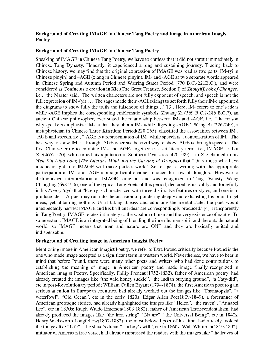 总之,中国唐诗中的意象与美国意象派诗中的意象,本质上是两种系统的存在。通过比较研究,我们发现中国唐诗中的意象与美国意象派诗中的意象确实有相似之处:除了强调传统观念的继承和本质外,两者都从自然世界中获得灵感和创造,都注重人的内心情感的表现和非同寻常的思考等。同时,中国唐诗中的意象与美国意象派诗歌中的意象也有着明显的差异:中国唐诗中的意象是在不同的社会环境和历史背景中培育起来的,中国唐诗中的意象是以其古老的几千年为源头,美国意象派诗歌中的意象是以其前几个世纪的奋斗历程为根基的。此外,它们是不同的哲学信仰、民族文化以及民族意识的结果。简言之,中国唐诗中的