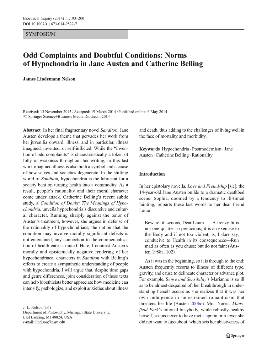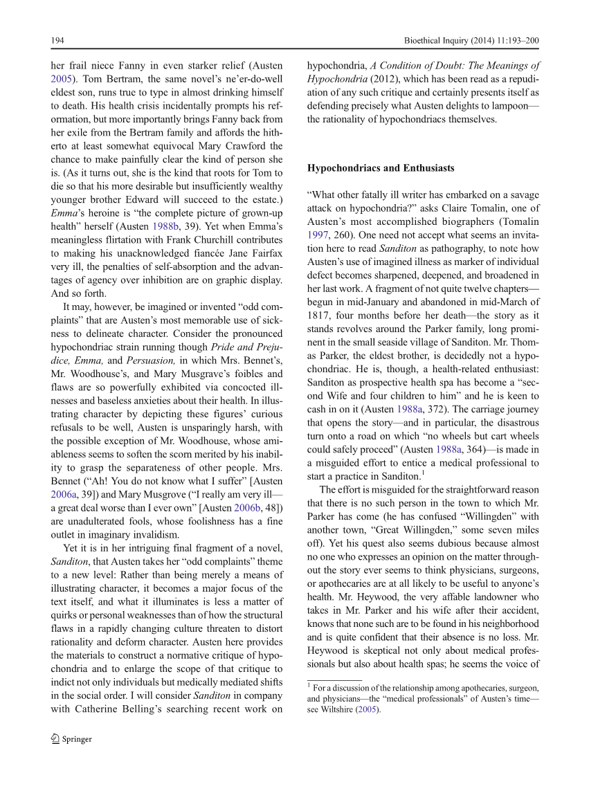 简·奥斯丁在其最后的零散小说《桑迪顿》中提出了一个贯穿其少年时代的作品主题:疾病,尤其是想象中,发明或自我造成的疾病。尽管“奇怪的抱怨的发明”在整个写作过程中通常是愚蠢或虚弱的象征,但在最后一部作品中,想象中的疾病既是自我和社会退化的象征,也是其原因。在不断变化的桑迪顿世界中,疑病症是一个致力于将健康转化为商品的社会的润滑剂。结果,人们的理性及其道德品格受到攻击。凯瑟琳·贝林最近的微妙研究,《怀疑的条件:疑病症的含义》揭示了疑病症的话语和文化特征。但是,她强烈反对奥斯丁的处理,她 辩护疑病症的合理性。该条件可能涉及道德上重大缺陷的观点没有得到接受;与医疗保健商业化的任何联系都被忽略了。在这里,我将奥斯丁在桑迪顿中对她的疑病症性格的道德和认识论消极表达与贝林努建立对患有疑病症的人的同情理解的努力进行了对比。我将争辩说,尽管存在时间差异和体裁差异,但对这些文本的共同考虑可以帮助生物伦理学家更好地理解医学如何加剧、病理化以及利用对疾病和死亡的焦虑感,以及因此增加的在面对死亡和发病的情况下,要过上良好生活的挑战。