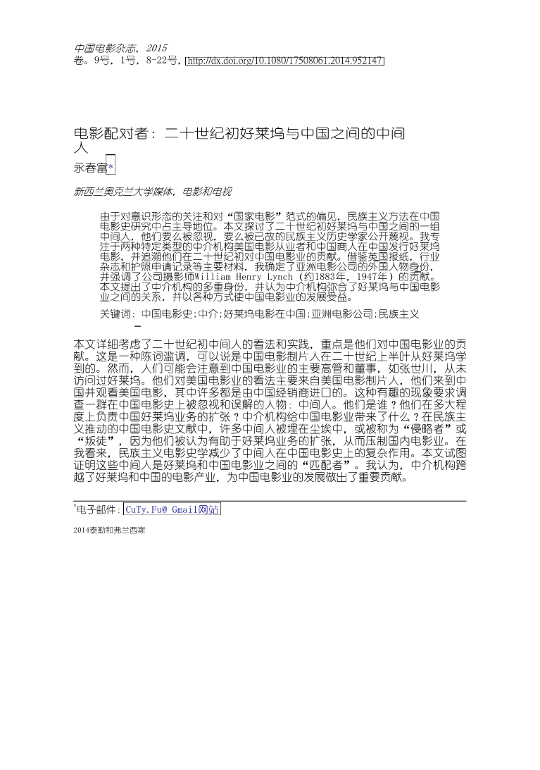 当代残疾人题材电影叙事的价值取向外文翻译资料 2021-10-27 21:19:21 英语原文共 16 页 英语原文共 15 页 原文和译文剩余内容已隐藏,您需要先支付 30元 才能查看原文和译文全部内容!立即支付 发小红书推广免费获取该资料资格。点击链接进入获取推广文案即可: Ai一键组稿 | 降AI率 | 降重复率 | 论文一键排版 PREVIOUS NEXT 您可能感兴趣的文章 二语听力附带词汇习得:一种维度方式外文翻译资料 论东北作家小说中所体现的萨满文化外文翻译资料 机械复制时代的艺术作品(第二稿)外文翻译资料 《骆驼祥子》英译本校评外文翻译资料 词汇化作为语法化的一种方式外文翻译资料 汉字的语境化教学外文翻译资料 女性对爱情的理解:当代女性小说中对异性恋的重新解读外文翻译资料 现实电视:观众和流行的事实电视外文翻译资料 过渡阶段和身份界限:中国少数民族的情况外文翻译资料 在尼日利亚西南部地区因暴力犯罪而被捕的人们在精神疾病方面的患病率、模式和相关因素外文翻译资料