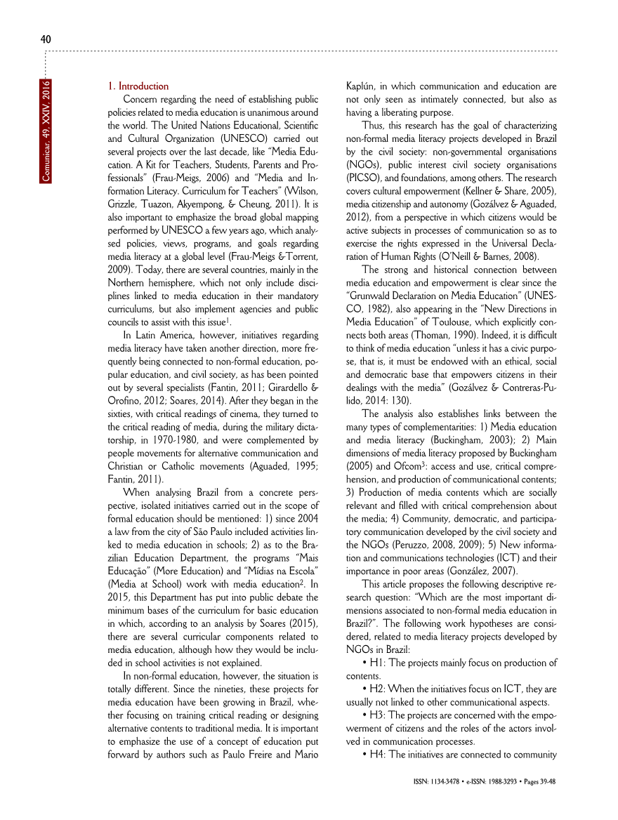 分析还建立了之间的联系多种类型的互补性:1)媒体教育媒体素养(Buckingham,2003);2)主媒介素养提出的白金汉郡(2005)和通信管理局3:访问和使用,关键理解,传播内容的产生;3)社交媒体内容的制作相关和充满批判性理解媒体;4)社区、民主和参与民间社会的交往与发展非政府组织(Peruzzo,2008,2009);5)新的信息和通信技术(ICT)及其贫困地区的重要性(Gonzaacute;lez,2007)。