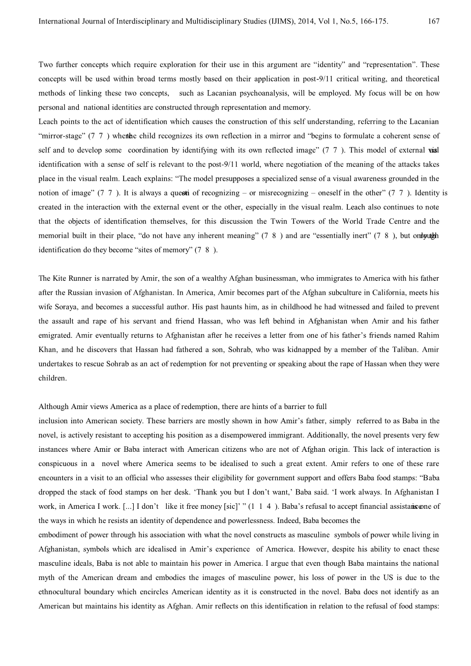 这个故事是在一个正在被摧毁的国家里精心制作的小说。这是关于阅读的力量,背叛的代价,救赎的可能性以及父亲对儿子的力量的探索——他们的爱,他们的牺牲,他们的谎言。另外两个需要探索的概念是“身份”和“表示”。这些概念将被广泛地应用于9/11事件后的评论文章中,并且将这两个概念联系起来的理论方法,如Lacanian精神分析,将会被使用。我的重点将是如何通过表现和记忆构建个人和国家的身份。