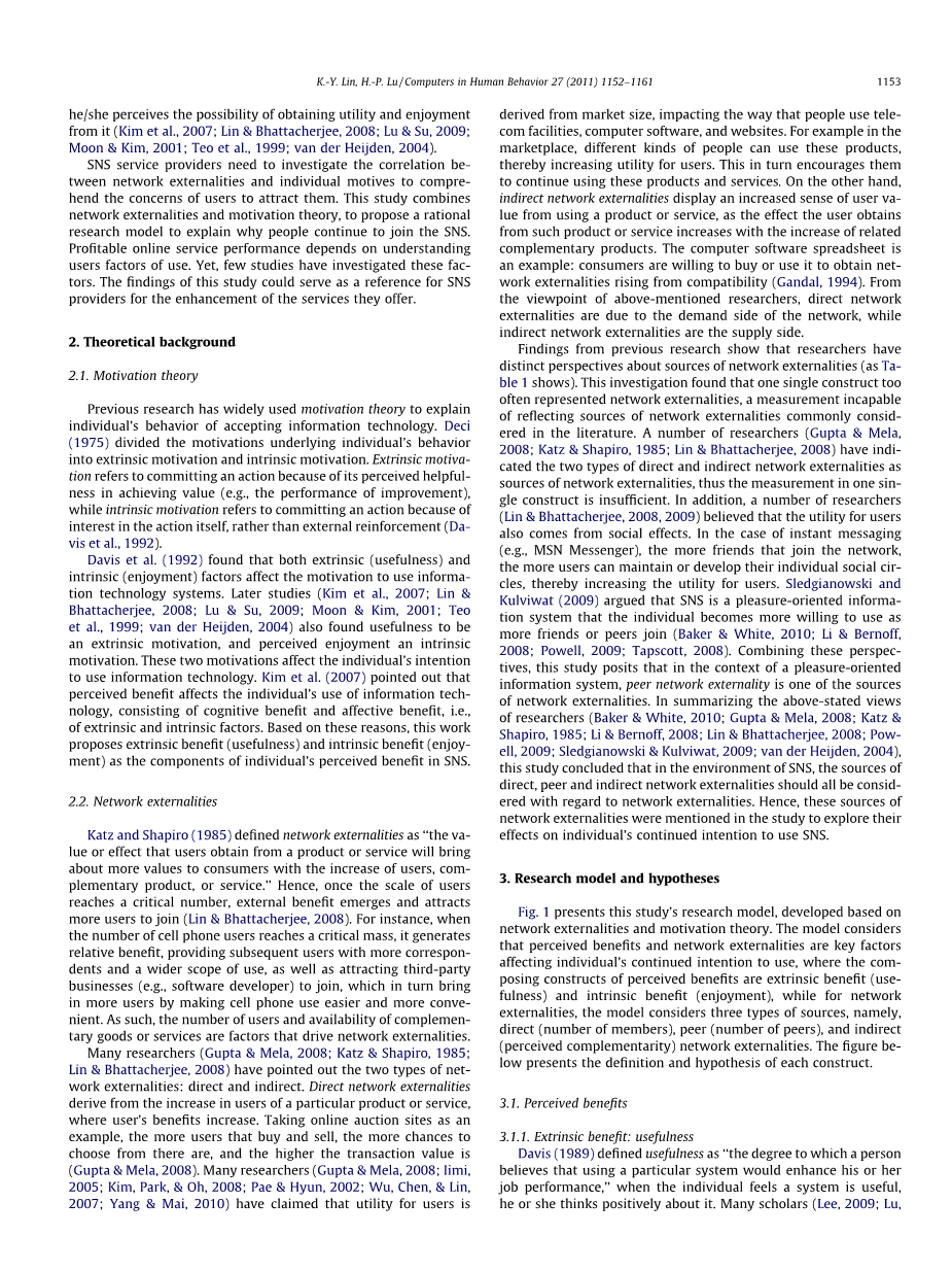 这项调查发现,一个单一的结构往往代表了网络外部性,这是一种无法反映网络外部性来源的测量,在文献中通常被认为。许多研究者(Guptaamp;Mela,2008;Katzamp;Shapiro,1985;Linamp;Bhattacherjee,2008)指出,直接和间接的两种网络外部性是网络外部性的来源,因此在单一结构中的测量是不够的。此外,一些研究人员(Linamp;Bhattacherjee,2008、2009)认为,用户的效用也来自社会效应。在即时消息(如MSN Messenger)的情况下,加入网络的朋友越多,用户就可以维护或发展自己的个人社交圈,从而增加用户的效用。Sledgianowski和Kulviwat(2009)认为,社交网络是一种以快乐为导向的信息系统,随着更多的朋友或同龄人加入,个人变得更愿意使用(Bakeramp;White,2010;Liamp;Bernoff,2008;Powell,2009;Tapscott,2008)。结合这些观点,本研究假设在快乐导向的背景下的信息系统中,同伴网络外部性是网络外部性的来源之一。在总结上述研究者的观点时(Bakeramp;White,2010;Guptaamp;Mela,2008;Katzamp;Shapiro,1985;Liamp;Bernoff,2008;Linamp;Bhattacherjee,2008;Powell,2009;Sledgianowskiamp;Kulviwat,2009;van der Heijden,2004),研究得出结论:在SNS环境中,直接、同伴和间接网络外部性的来源都应该考虑到网络外部性。因此,研究中提到了网络外部性的这些来源,以探讨其对个体持续使用SNS意图的影响。