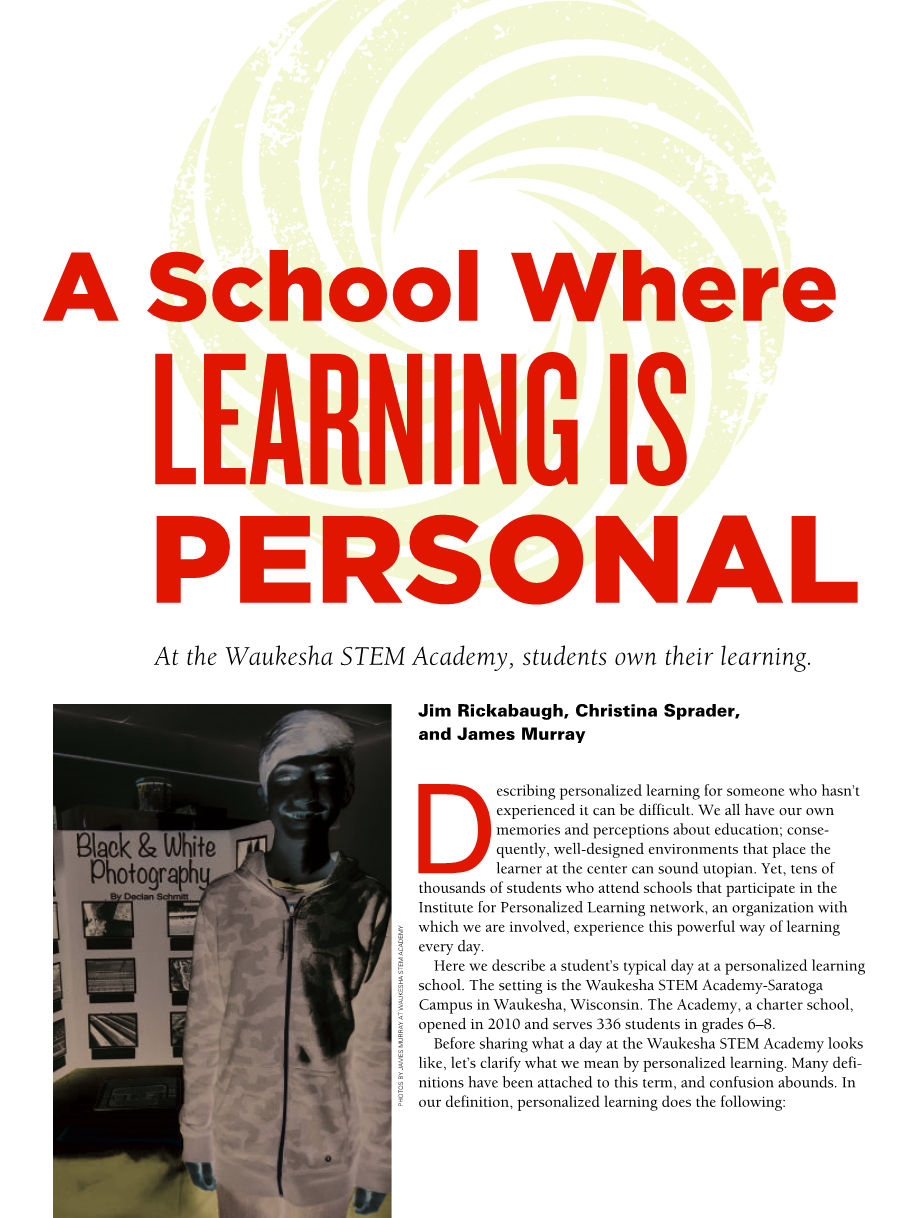 Jim Rickabaugh (jrickabaugh@institute4pl.org)是个性化学习研究所的高级顾问(http://institute4pl.org)。他是《挖掘个性化学习的力量:学校领导者的路线图》(ASCD, 2016)一书的作者。在推特上关注他@drrickabaugh。Christina Sprader (csprader@institute4pl.org)是个性化学习研究所的副主任。关注她的推特@csprades。James Murray (jmurray@ Waukesha .k12.wi.us)是威斯康星州Waukesha STEM学院的校长。关注他的推特@edUcation