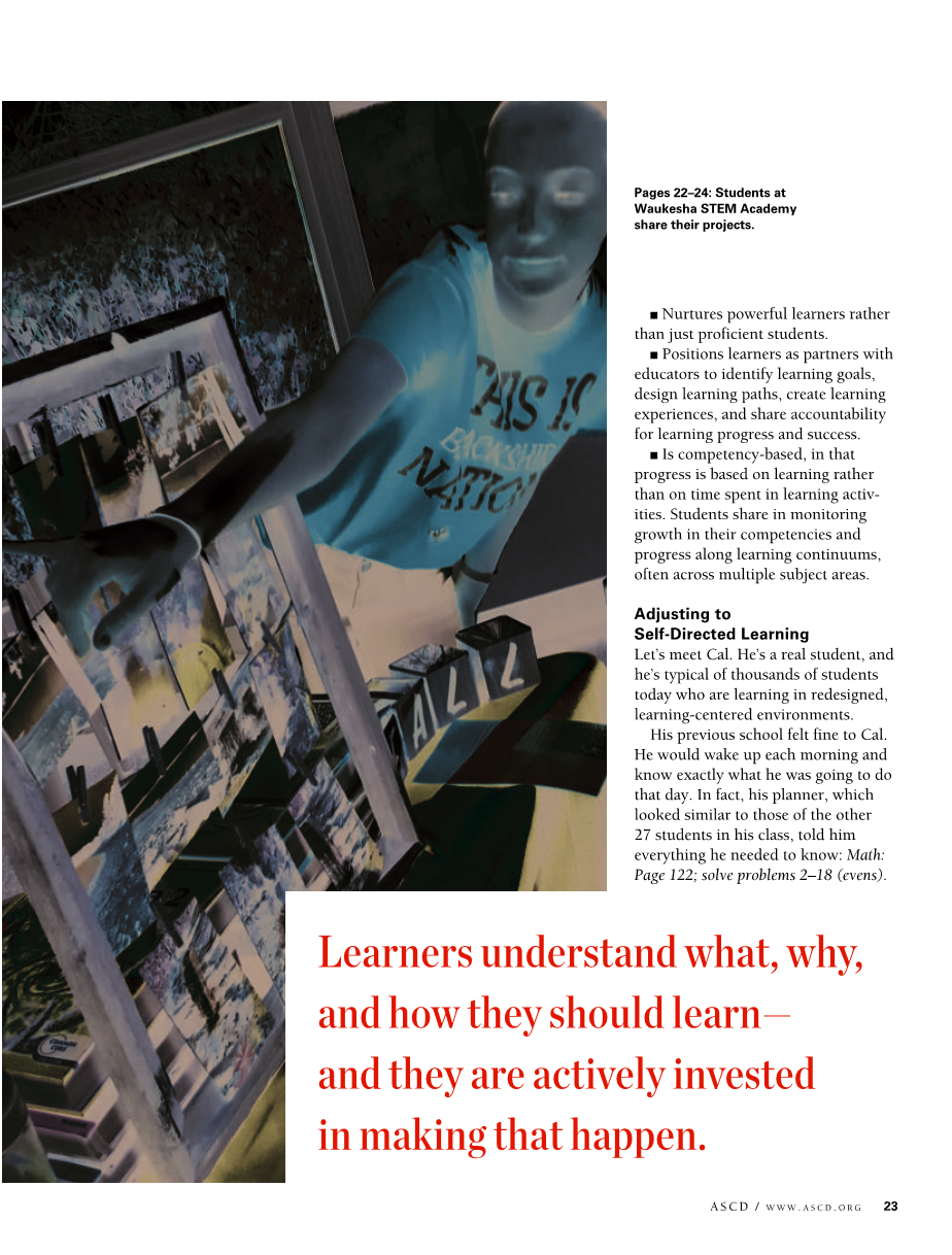 我们见见卡尔吧,他是一个真正的学生,他是今天成千上万的学生的典型,他们在重新设计的、以学习为中心的环境中学习。卡尔感觉他以前的学校很好。他每天早上醒来,确切地知道他那天要做什么。事实上,他的规划师,看起来类似于他班级其他27名学生,告诉卡尔所有他需要知道的:数学:第122页;解决问题 2~18(偶数)。