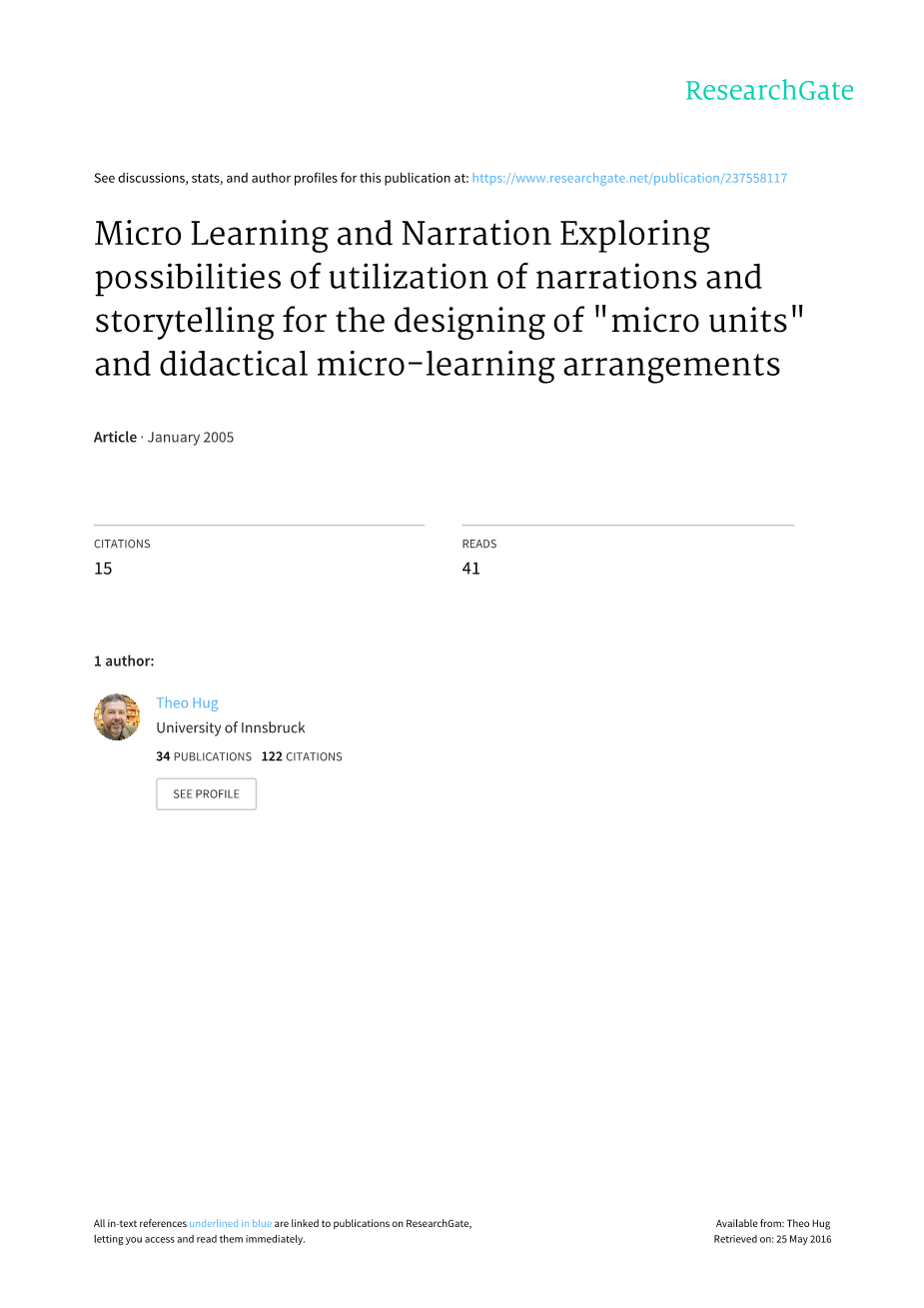 在不久的将来,不同的学习形式,不同的教学安排,也进一步技术如掌上电脑、电视机或自动售货机将探索。在这方面,概念和实践的叙述,将响起了关于问题的动机,改进,尤其是重新整合方面,重新组合和微活动化、学习序列和信息块。那么,如何才能我们在学习安排中教育目的的叙事和讲故事吗?