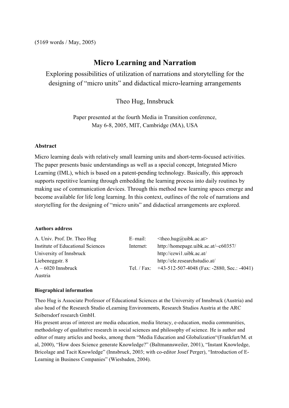 Theo Hug 是奥地利因斯布鲁克大学教育科学学院副教授,同时是e-Learning学习环境研究领域的领先者。他目前的兴趣研究领域是教育媒介,媒体文学,在线教育,社交媒体,在社会科学和哲学科学中采用定性的科学研究方法。他是很多书籍和文章的作者和编辑者,例如,“Media Education and Globalization”(Frankfurt/M. etal, 2000),“How does Science generate Knowledge?” (Baltmannsweiler, 2001),“Instant Knowledge,Bricolage and Tacit Knowledge” (Innsbruck, 2003; with co-editor Josef Perger),“Introduction of ELearning in Business Companies” (Wiesbaden, 2004)。