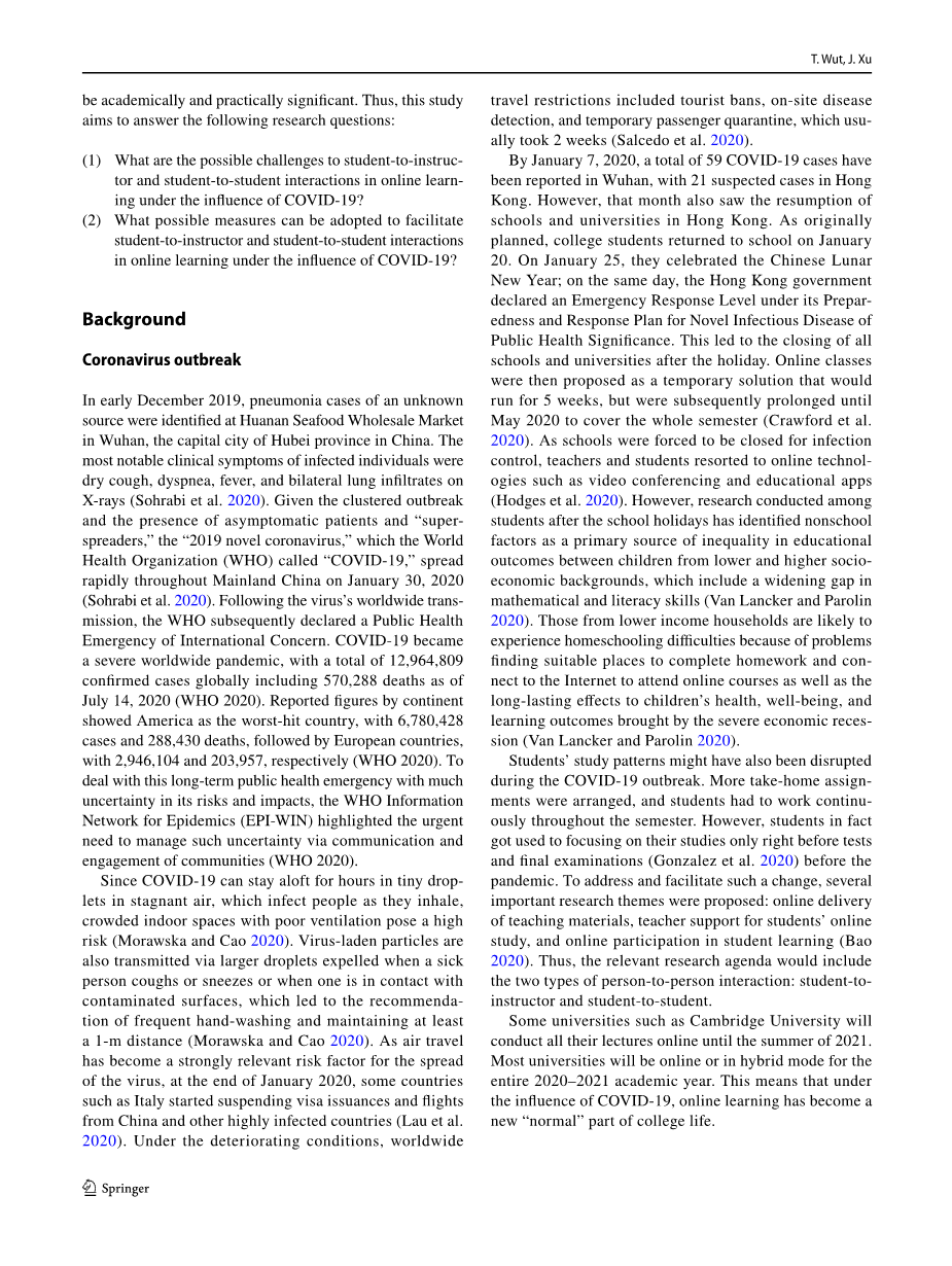 在这项研究中,我们在香港对大学生和教师进行了深度访谈。作者于2020年3月开始这一过程,并申请了伦理批准。在获得学院的批准后,作者于2020年4月向教师和学生发出了邀请。参与完全是自愿的,所有参与者都提供了知情同意书。由于新冠疫情的原因,传统的考试被额外的回家作业所取代,受访者的时间安排变得有限。一些曾表示有兴趣参与本研究的学生和教师要求退出。因此,在研究期间(即2020年5月),共有24名研究参与者(17名学生和7名教师)通过面对面或在线形式参与了本研究。访谈是用中文进行的,但由专业编辑记录并翻译成英文(表1)。
