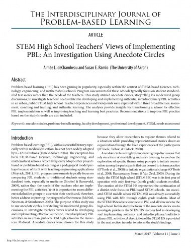 基于问题的学习(PBL)尚未被K-12机构广泛采用时有着非常成功的过往,特别是在医学教育中(Hmelo-Silver,2004)。唯一的例外是基于STEM(科学,技术,工程和数学)的学校,它们经常采用基于项目或基于问题的学习作为教学模式,原因是它适合教学工程应用(Meyrick,2011)。 PBL项目评估通常侧重于使用标准化测试将PBL教学模式下学生的表现与传统教学模式下学生的表现进行对比,而不是比较实施PBL活动的教师的需求,这种情况是在医学中尤为显著(Strobel和Barneveld,2009)。然而,评估不同的利益相关者群体以确定他们的需求是十分重要的,这可以更好地解决提高项目效率的问题(McNeil,Newman,&Steinhauser,2005)。这项研究的目的是利用轶事圈,通过适度的小组讨论讲故事,调查教师在美国中西部城市公立STEM高中开发和实施有效、真实、跨学科PBL活动的观点。本研究选择了轶事圈,因为它们允许研究人员探索与情境相关的主题,同时通过参与者的生活经历提供关于组织的代表性故事(O#39;Toole,Talbot,&Fidock,2008)。