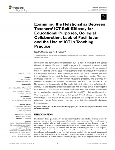 信息和通信技术(ICT)是现代生活的一个综合和核心要素,它的迅速出现正在改变工作和学习的执行和组织。数字技术不仅对学校很重要,对教师的工作日也很重要。然而,在今天的教师群体中,并不是每个人都具备使用数字技术教学所需的知识。近年来的研究表明,教师的自我效能感对教师的教育实践有重要的影响。本文以教育为目的,探讨教师的信息技术自我效能感,并探讨教师自我效能感的假设前提。分析了来自116所挪威学校的1158名教师的数据。研究结果表明,教师在教学实践中使用ICT的自我效能感与教师在教学中使用ICT的情况及总体ICT自我效能感有关。此外,研究结果显示,教师间的校际合作与资讯及通讯科技在教学上的应用有正向关系。对这些发现的一种解释是,一般的ICT自我效能感对于发展教育目的的ICT自我效能感和能够在教育中使用ICT是必要的。然而,需要进一步的研究来仔细研究这些概念之间的关系。
