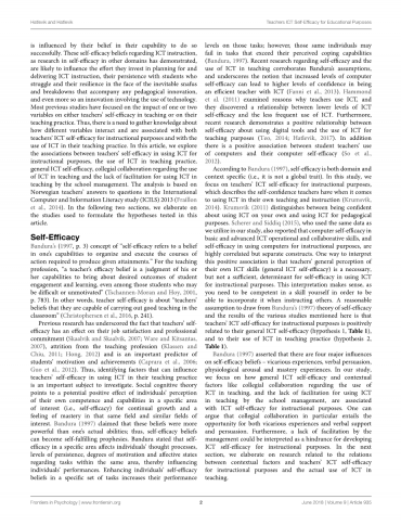 据班杜拉所说 (1997),自我效能感既取决于领域,也取决于情境。,这不是一个全球性的特征。在本研究中,我们关注教师的ICT自我效能感教学目的,这描述了教师在自己的教学中使用ICT时所具有的自信(Krumsvik, 2014)。Krumsvik(2011)区分了对自己使用ICT有信心和将ICT用于教学目的。Scherer和Siddiq(2015)使用了与我们在研究中使用的相同的数据,他们还报道了计算机自我效能在基础和先进医学、操作和协作技能以及在将计算机用于教学目的方面的自我效能感是高度相关的,但又是独立的结构。一种解释这种积极联系的方法是,教师对自己ICT技能(ICT自我效能感)的总体认知是自我效能感的必要决定因素,但不是充分的。这种解释是有道理的,因为你需要自己有能力掌握一项技能,以便能够在指导他人时将其融入其中。班杜拉在自我效能感理论中提出的合理假设 (1997) 和这里提到的各种研究的结果是,教师ICT自我效能对教学目的是正相关的通用ICT自我效能(假设1,表1),和他们在教学实践中使用ICT(假设2,表1)。Bandura(1997)认为影响自我效能信念的因素主要有四个:替代体验、言语说服、生理唤醒和掌控体验。在我们的研究中,我们关注一般的ICT自我效能感和相关因素,如在教学中使用ICT的大学合作,以及学校管理层在教学中使用ICT时缺乏便利,如何与教学目的的ICT自我效能感相关。有人可能会说,大学合作特别需要替代体验、口头支持和说服的机会。此外,管理部门缺乏便利可被解释为妨碍发展用于教学目的的信息通信技术自我效能感。下一节,我们将详细阐述情境因素与教师教学信息技术自我效能感的关系,以及信息技术在教学中的实际运用。