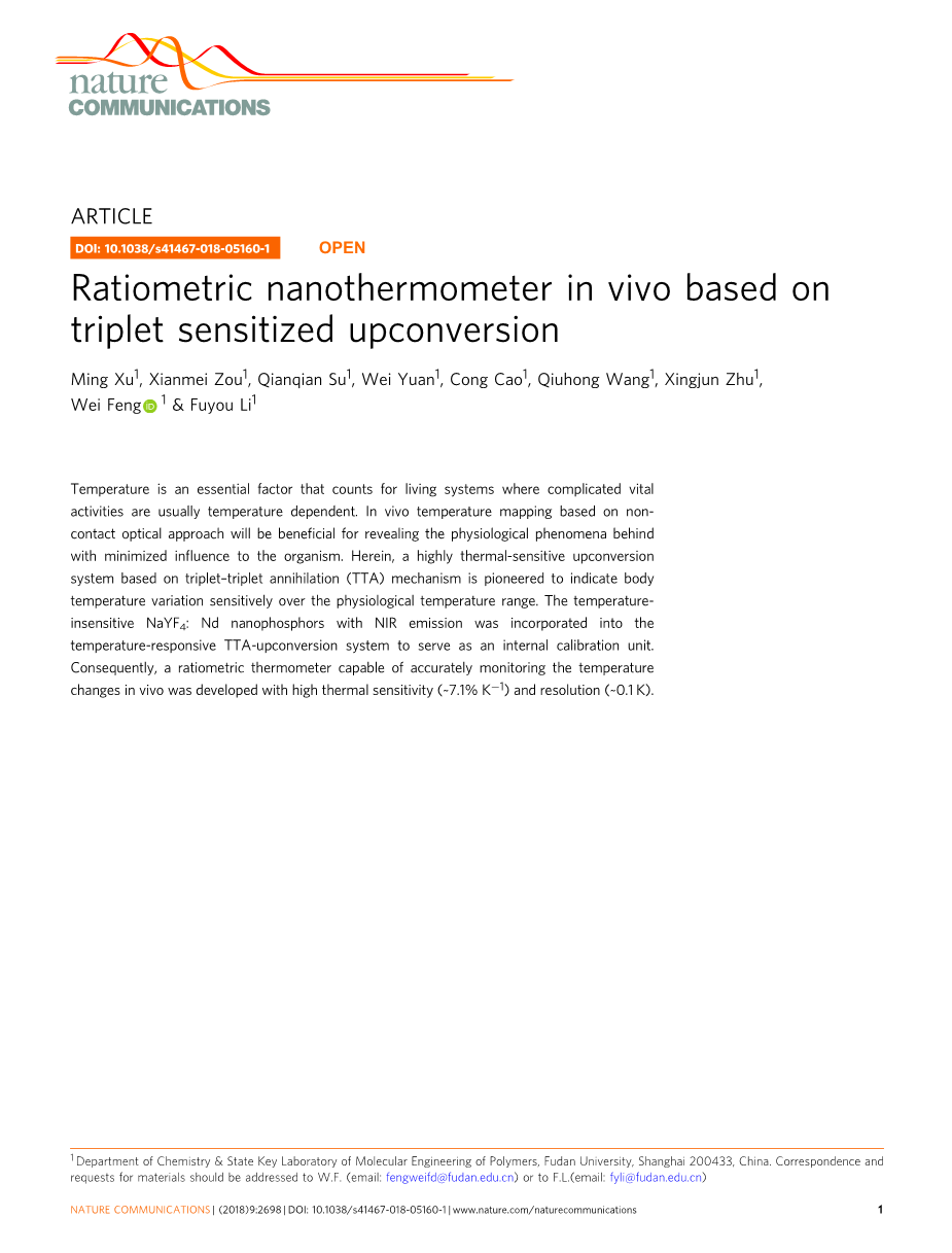 坦白地说,这个优秀的TTA-Nd-NPs温度计的弱点被揭示为绿色UCL信号的中等穿透深度(补充图20)。因此,在近红外光谱领域工作的温度敏感TTA-UC系统可能成为未来深层组织应用的一个有吸引力的突破。近红外发射敏化器作为参考,也可以简化系统的结构。