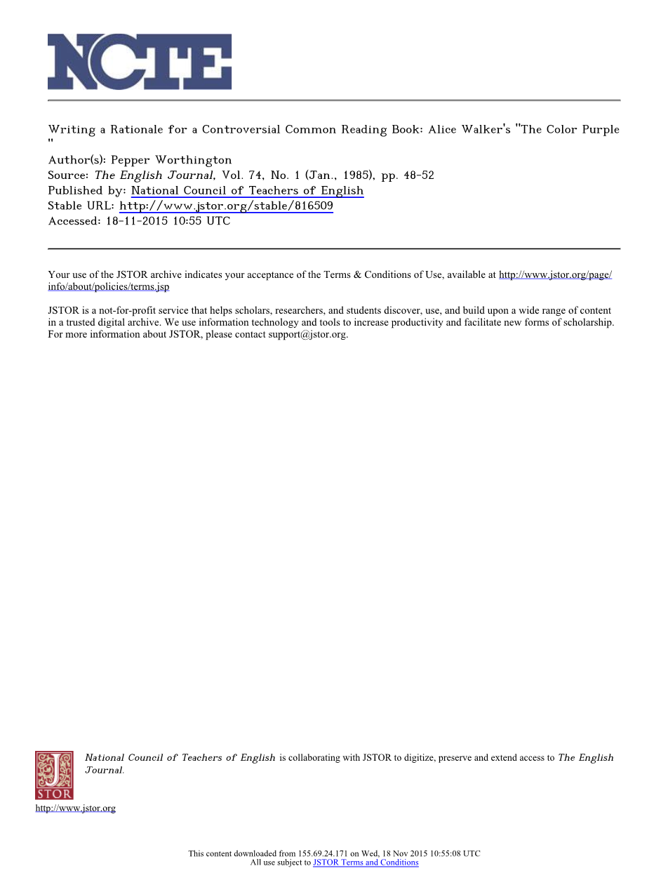 在这本书中,检查者可能会转载许多话来证实他们认为这本书不适合作为阅读书目的意见。然而,所有的话语都已经在电视,走廊,浴室,角落里,或高中生知道的情况下使用。这些话可能不是很悦耳,他们可能不会反映我们所希望的话,但是这些话存在并反映了现实。艾丽斯·沃克并没有用西莉的信来亵渎书籍。相反,她坚持说,这些话来自于黑人的体验。如果人类受到虐待,语言就会反映出来。