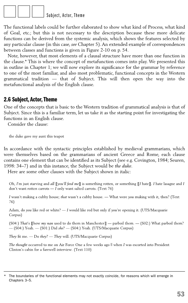 如果所有小句都像这个小句一样,一个成分发挥所有三种功能,那么识别和解释主语就不成问题了。我们可以用这个术语来概指三个定义,并用它来标注任何一个同时担当所有这些相关功能的成分。但这样又会假定每个小句中只有一个成分具有所有这三种功能,但实际情况并非如此。许多小句都没有一个三合一的成分。例如,我们说