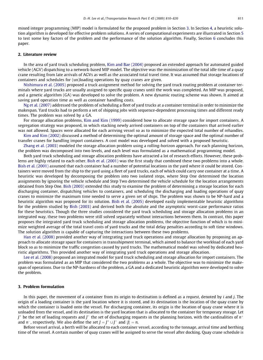 码头调度和存储分配问题吸引了大量的研究工作。然而, 这些问题彼此之间有着高度的联系。比什 (2001)的研究是将这两个问题结合起来的第一项研究。Bish等人(2001)假设每个集装箱在堆场里都有许多可能存放的地点。集装箱用一对集卡从船上搬运到堆场内,每个卡车每次可以装载一个集装箱。通过将问题分解为两个独立的步骤来开发启发式算法,其中步骤一在忽略集卡工作时间表的前提下,来确定位置分配,步骤二为步骤一获得位置分配确定车辆时间表。Bish(2003)扩展了这项研究,以检测每个卸货集装箱的存放位置,给集装箱调度车辆,并安排码头起重机的卸货和装货作业的问题,以最大限度地减少服务给定船舶所需的最大时间。该问题表现为NP-hard问题,Bish提出了启发式算法来解决问题。 Bish等人(2005)针对Bish(2003)研究的问题开发了容易实现的启发式算法,并推导出这些启发式算法在绝对和渐近最差情况下的性能比。尽管三项研究综合考虑了卡车调度和存储分配问题,但这两个问题仍然是分开解决的,两者之间没有交互作用。相比之下,本文提出了集成式货场卡车调度和存储分配问题,其目标函数是根据软时间窗口最小化码头卡车总行程费用和总延迟罚分的加权平均值。本文提出的解决方案能够捕获这两个问题之间的相互作用。