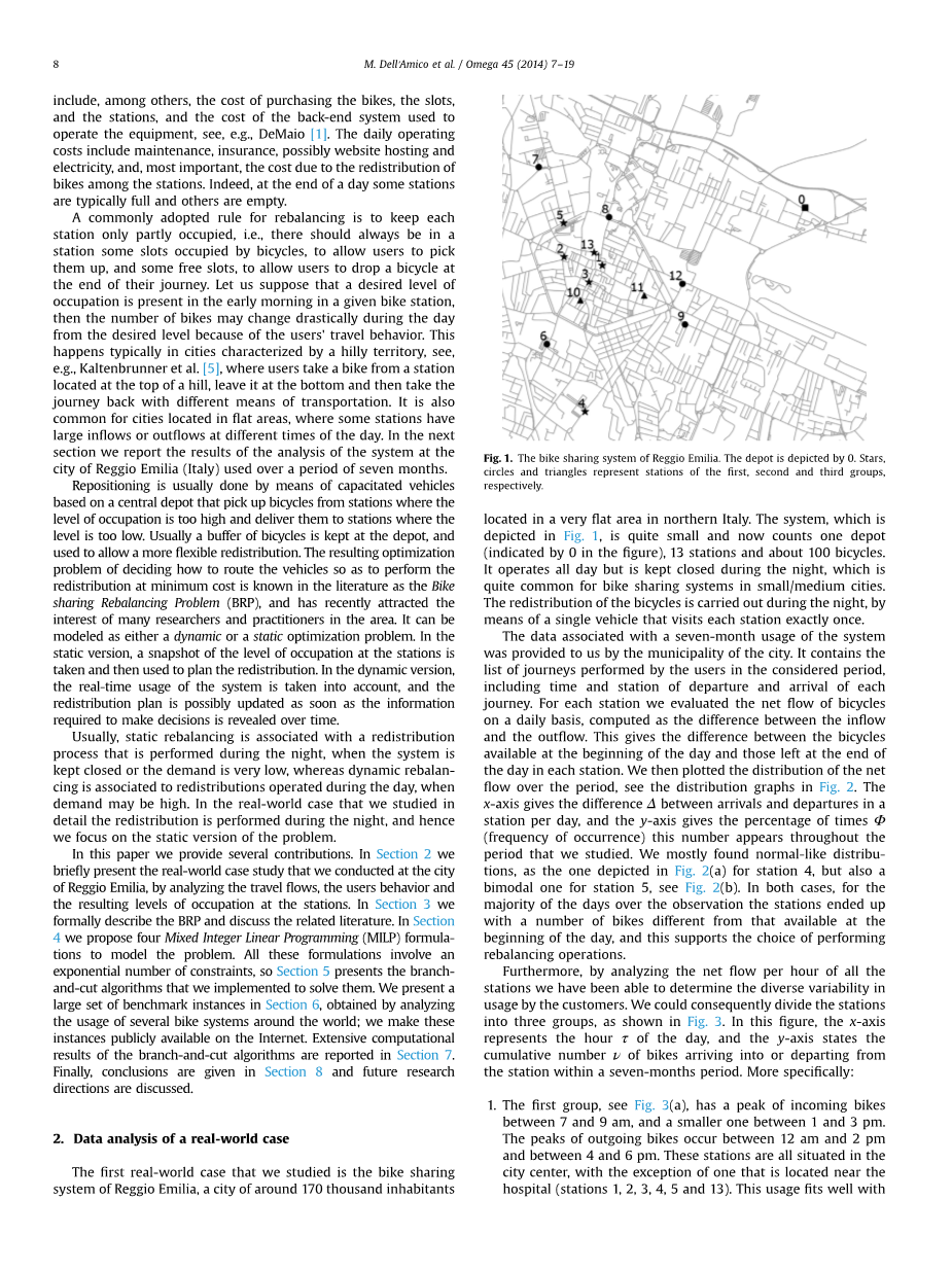 在本文中,我们提供了几个贡献。在第2节中,我们通过分析车行流量,用户行为以及由此导致的站台占用程度,简要介绍雷焦艾米利亚市的相关情况。在第3节中,我们正式描述了BRP并讨论了相关文献。在第4节中,我们提出了四个混合整数线性规划(MILP)公式来模拟问题。所有这些公式都涉及指数数量的约束条件,因此第5部分介绍了我们为解决它们而实施的分支算法。我们通过分析世界各地几种自行车系统的使用情况,在第6节中提出了一系列基准实例;我们在互联网上公开这些实例。最后,第8节给出了结论,并讨论了未来的研究方向。