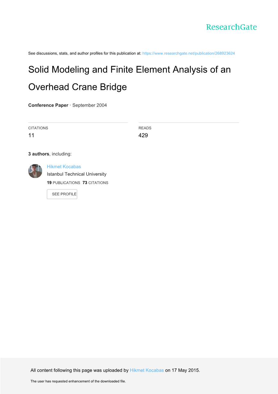 关于结构和构件应力以及静载荷下的安全性和起重机的动态行为已经有许多已发表的研究[5-16]。 Demirsoy [17]研究了桥梁结构的实体建模和有限元分析以找到位移和应力值。 [18]中提供了应用于道路桥梁结构的实体建模技术,以及使用有限元方法分析这些结构。在这项研究中,使用FEM90软件发现压力和位移。 Celiktas [19]研究了起重机桥梁的实体建模,桥梁上不同点的荷载以及有限元方法的应用,其研究介绍了桥式起重机的有限元方法的结果。