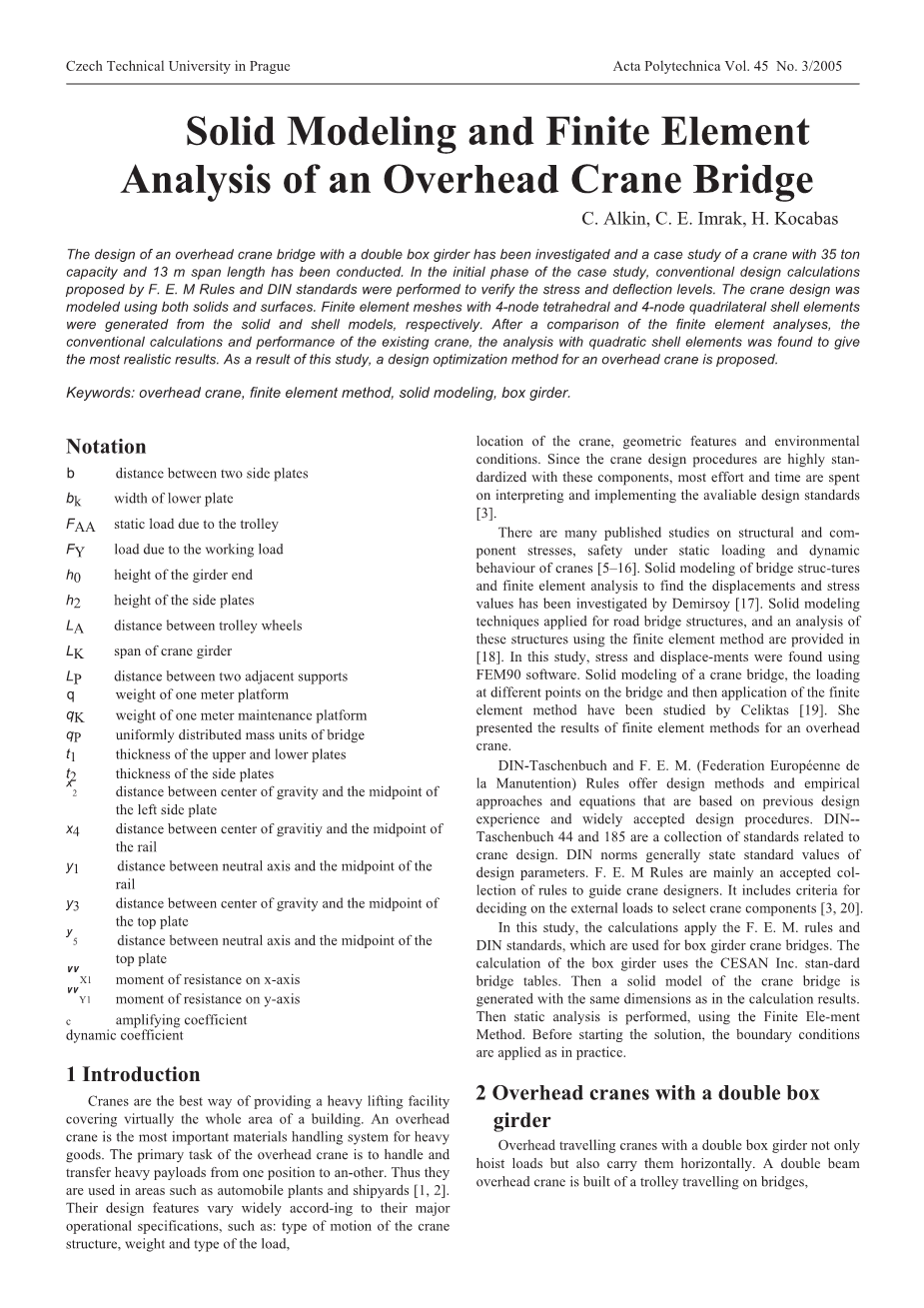 本文对双箱梁桥式起重机桥梁的设计进行了研究,并对一台35吨级,13米跨度的起重机进行了实例研究。在案例研究的初始阶段,执行了由F.E.M规则和DIN标准提出的常规设计计算,以验证应力和挠度水平。起重机设计使用固体和表面建模,分别由实体和壳模型生成具有四节点四面体和四节点四边形壳单元的有限元网格。在对有限元分析并经过现有起重机的常规计算和性能进行比较之后,发现使用二次壳单元的分析给出了最现实的结果。作为这项研究的结果,本文提出了一种桥式起重机的设计优化方法。